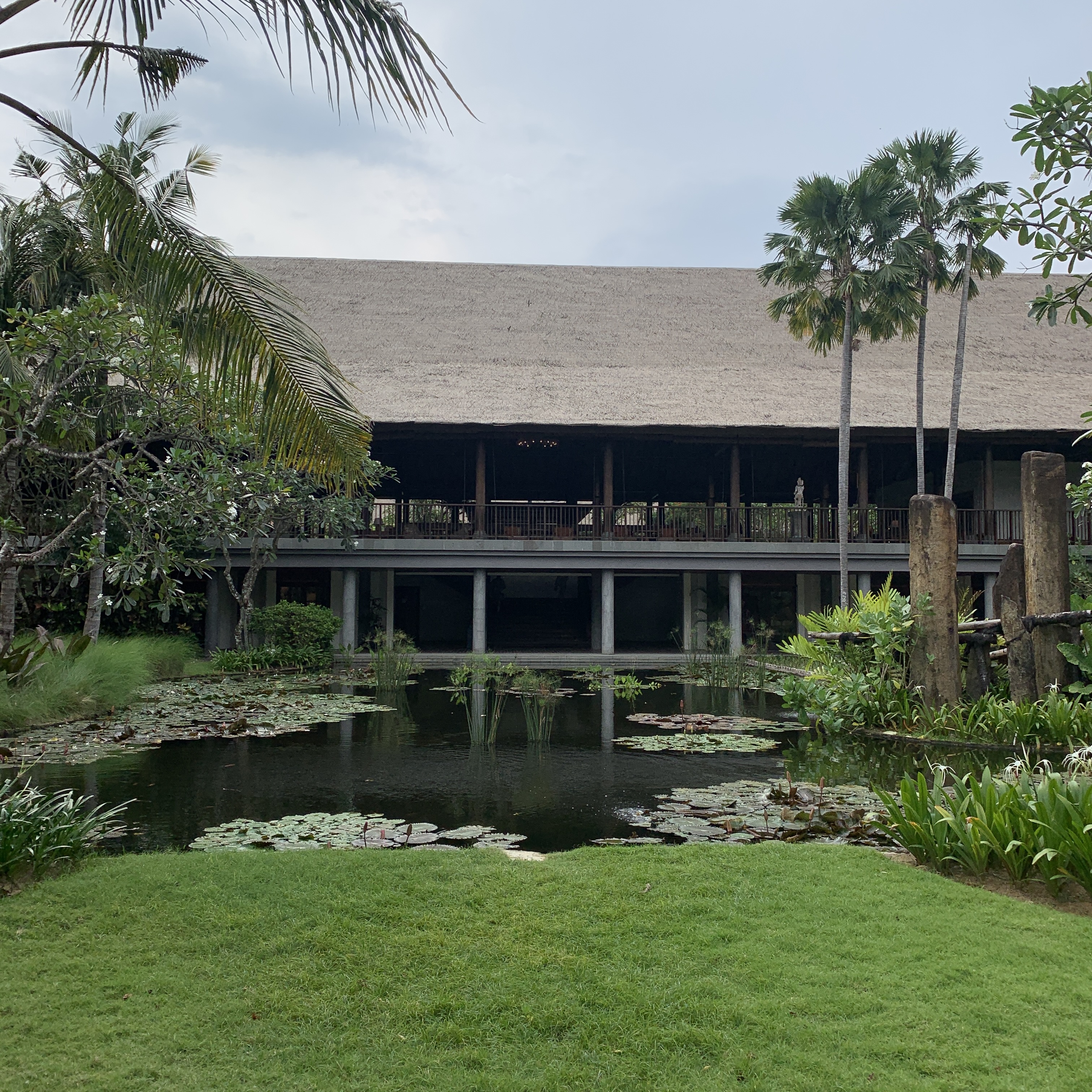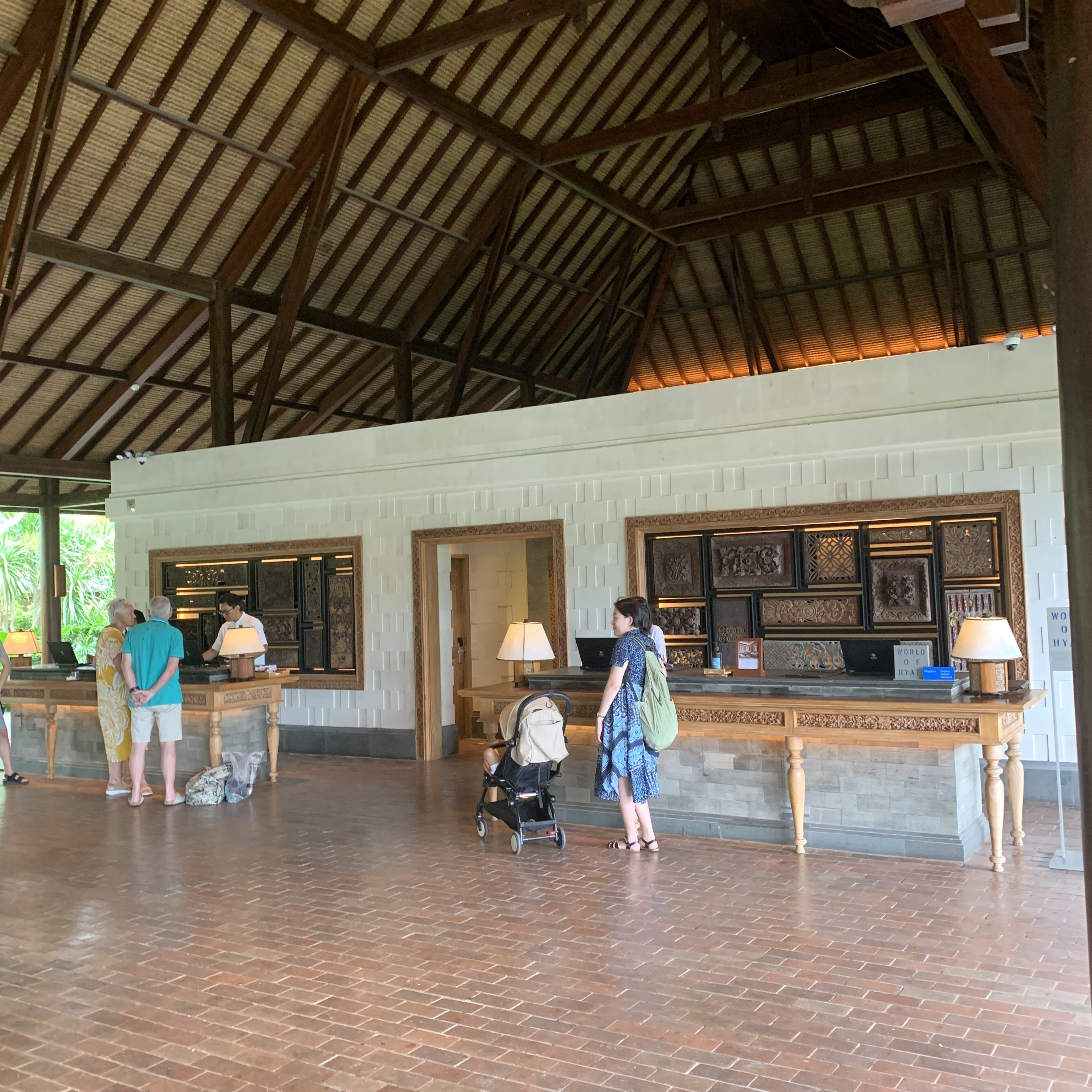 하얏트 리젠시 발리의 로비 모습. 발리 전통 구조물로 지었지만 확실히 고급스럽다. 높은 천장과 창문도 없고, 벽 없이 기둥만 있는 구조라 개방감이 상당하다. 동남아에서 흔히 볼 수 있는 구조. 로비는 넓어서 많은 인원들이 편하게 쉴 수 있다. 웰컴티는 얼음이 가득 들어있는 시원한 음료였는데 더운 날이라 굉장히 반가운 웰컴티였다.