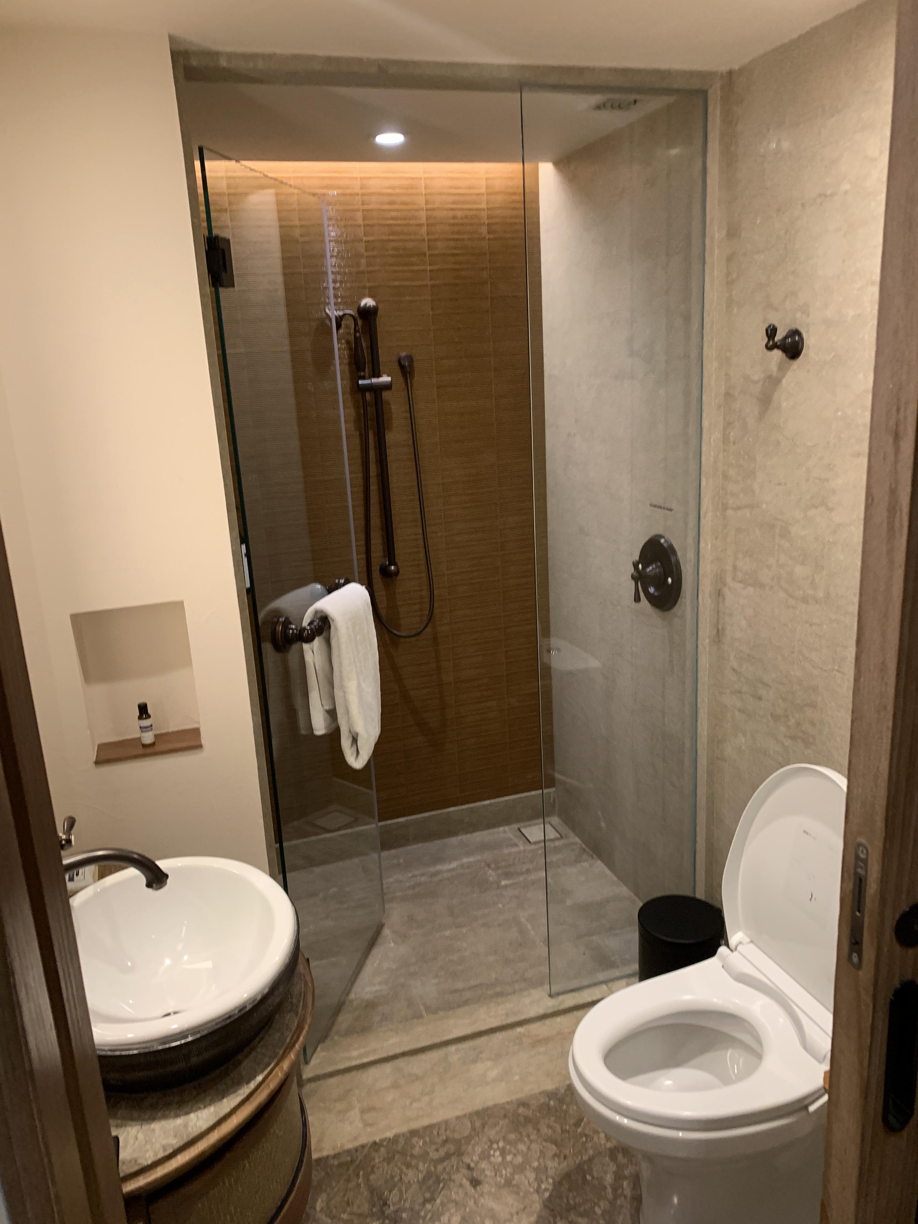 메인 욕실인데 굉장히 크다. 침실과 욕실 사이가 슬라이딩 도어로 되어있어 문을 닫으면 공간 분리가 되고, 욕실 안에서도 샤워실, 좌변기도 각각 문이 있다. 샤워실은 투명문, 좌변기는 반투명이라 안 보인다.