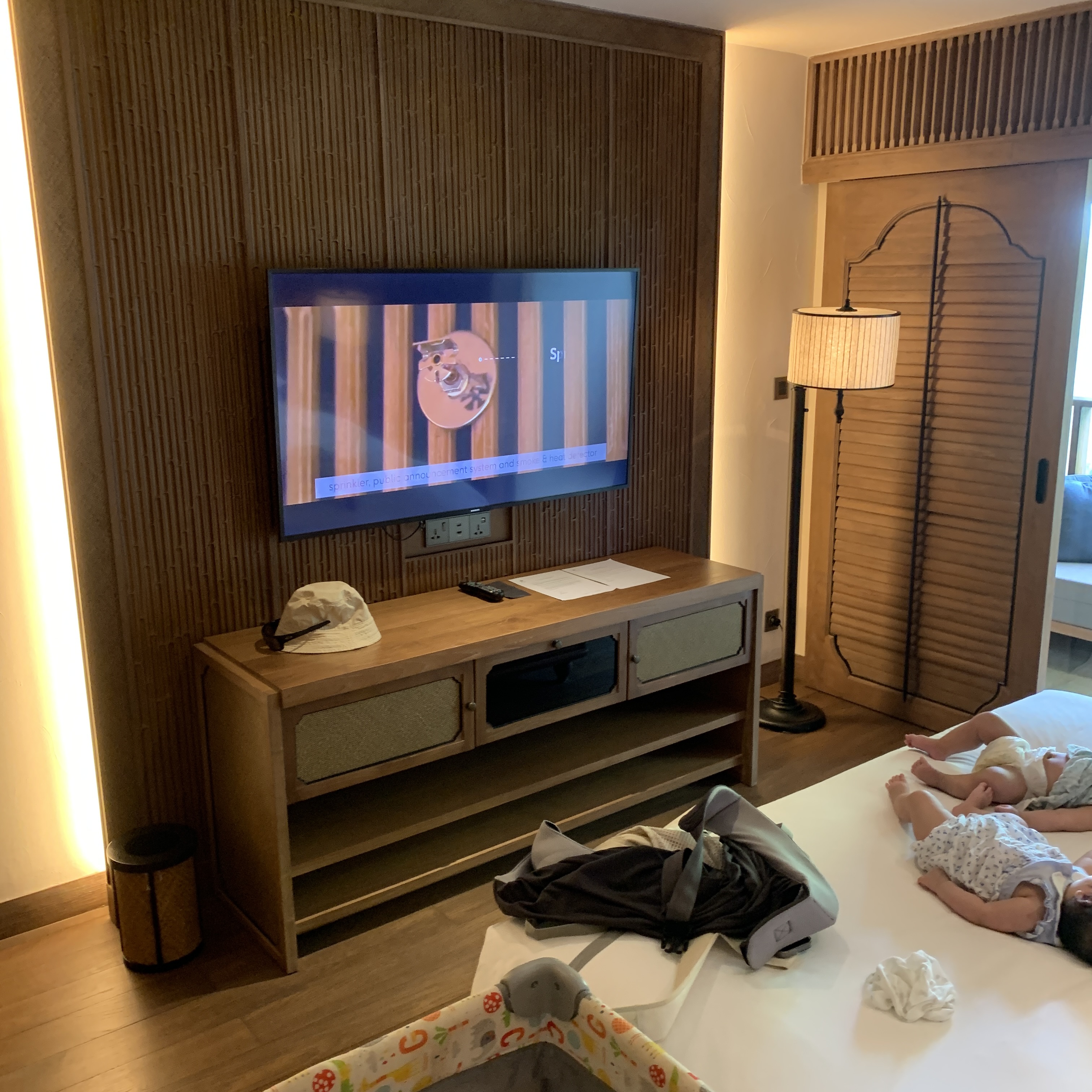 널찍한 침대와 아기침대. 그리고 반대편 TV가 있다. 정규 채널밖에 안 나온다. 사진엔 안 찍혔지만 블루투스 스피커(JBL charge 3)가 기본으로 제공돼서 밤에 노래를 들으며 하루를 정리하는데 굉장히 큰 도움이 되었다.
