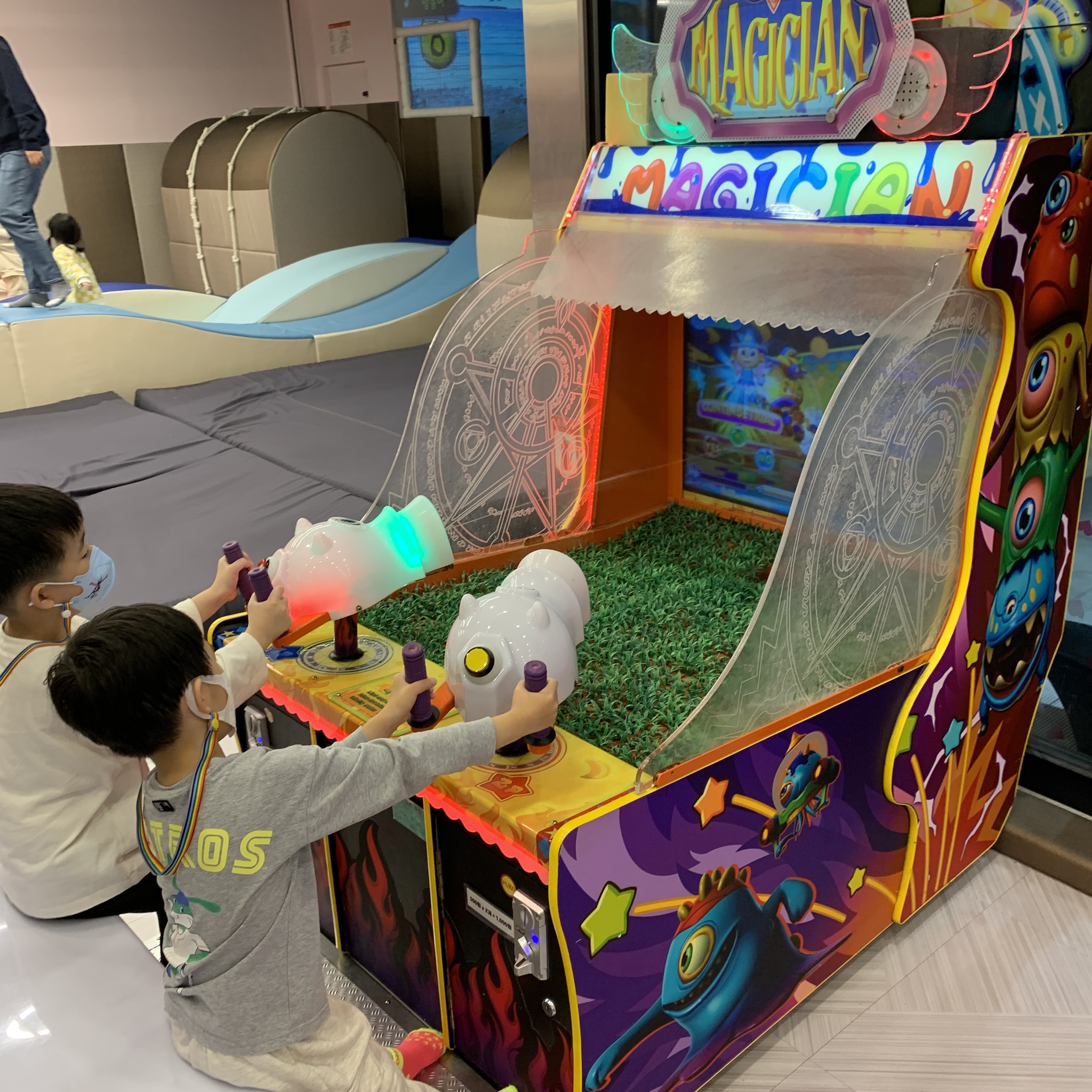 어린이들과 어른들을 위한 게임기도 있다. 신나게 뛰어놀 수 있는 키즈카페에서는 게임은 피하고 싶어 안 했다. 다행히 놀 수 있는 공간들이 다양하고 많아서 아들도 게임에 집착하지 않고 이곳저곳 돌아다니며 원 없이 놀았다.