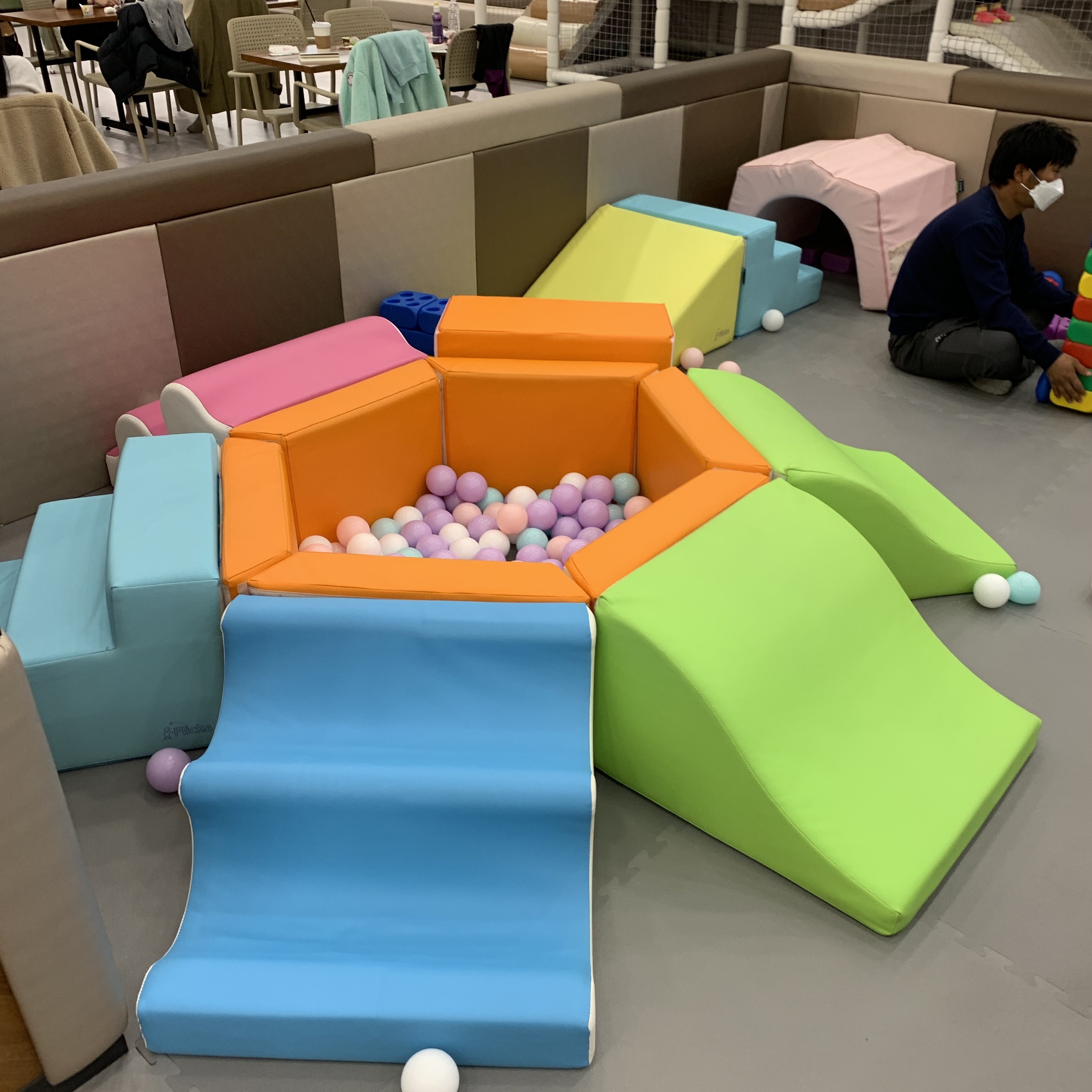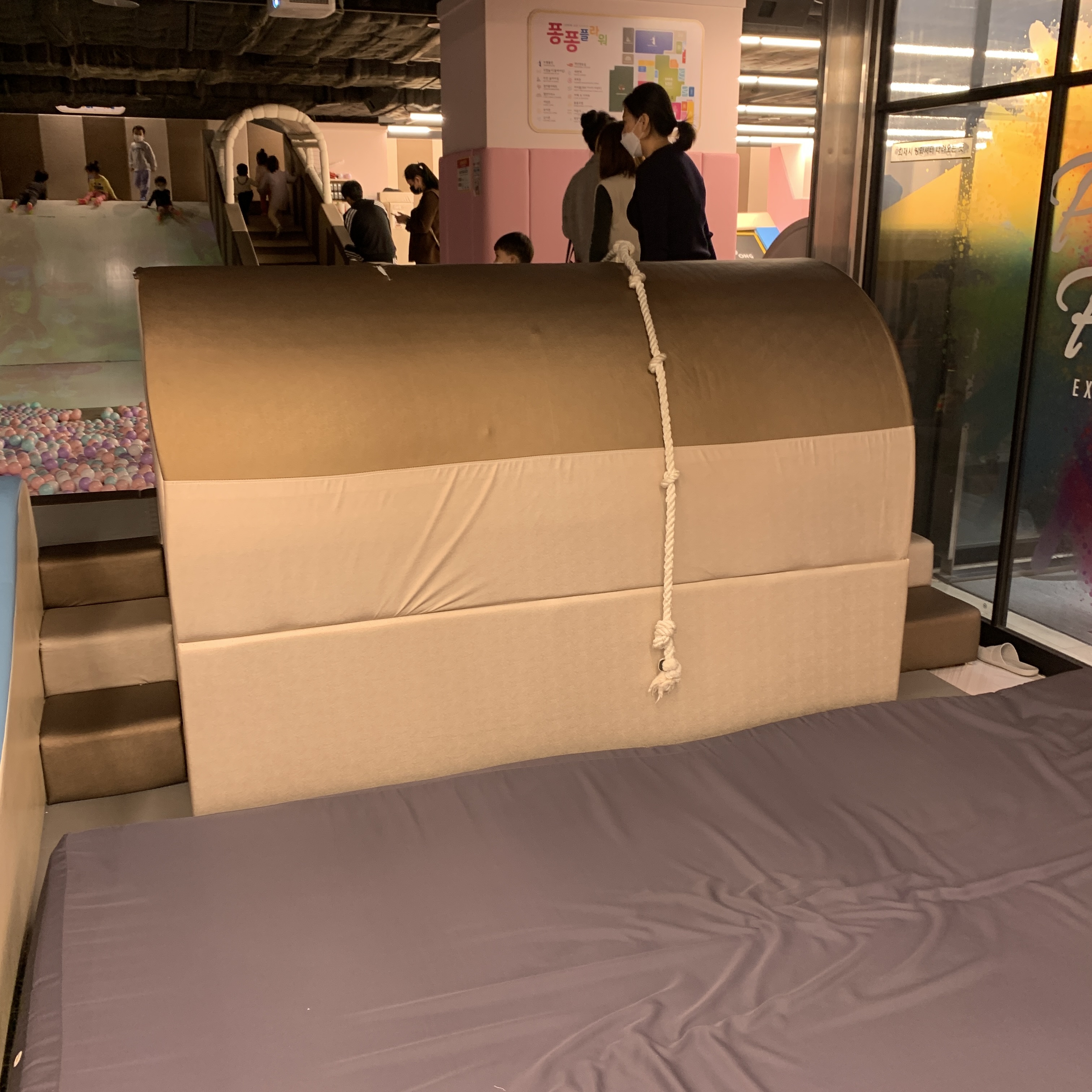 대형 미끄럼틀. 걸어서 올라가는데 계단이 스폰지로 돼어있어 푹신푹신하다. 미끄럼틀 경사로는 완만하고 아래쪽은 볼풀들로 가득차있어서 아이들이 다칠 우려가 없어보인다. 걱정 없이 혼자 태워도 된다