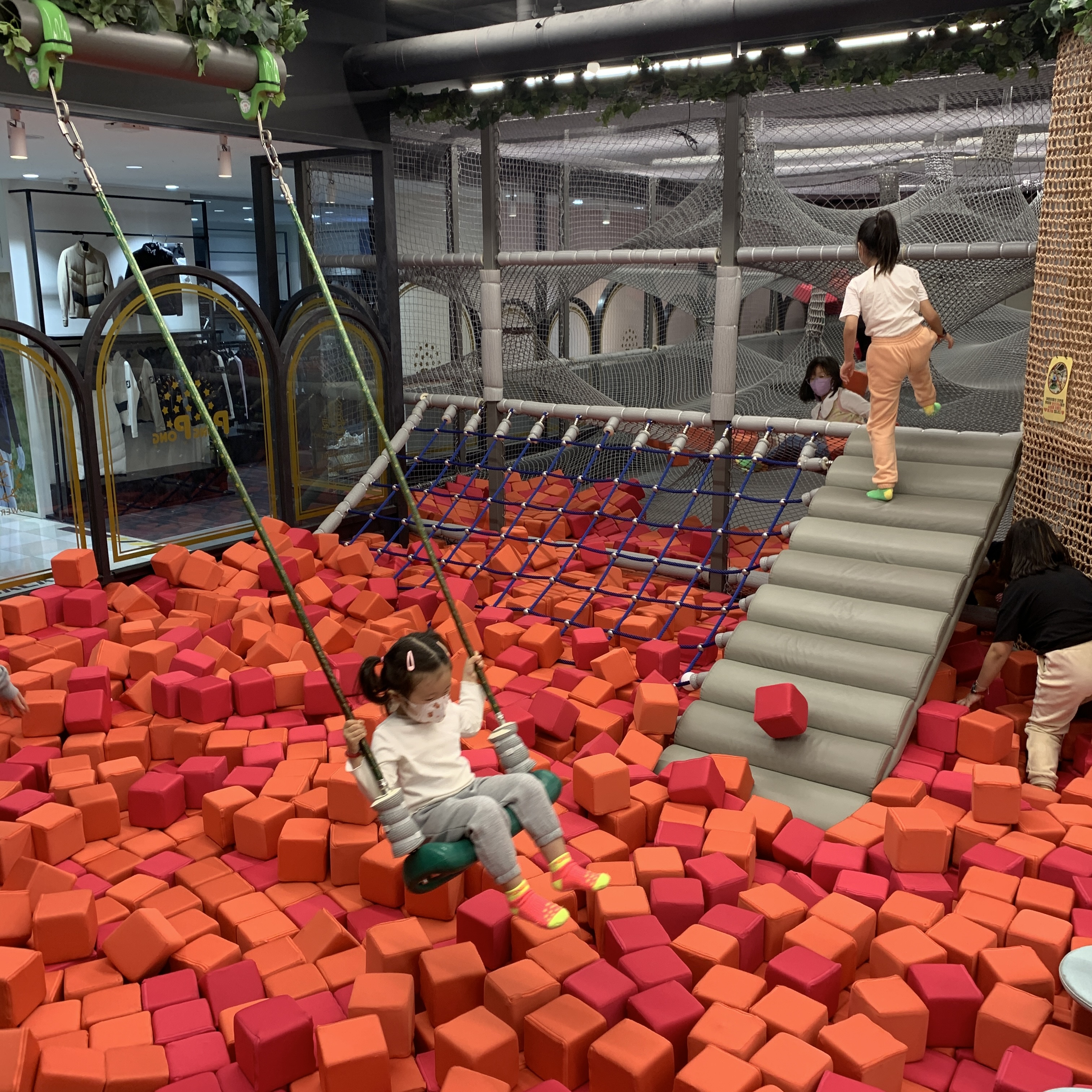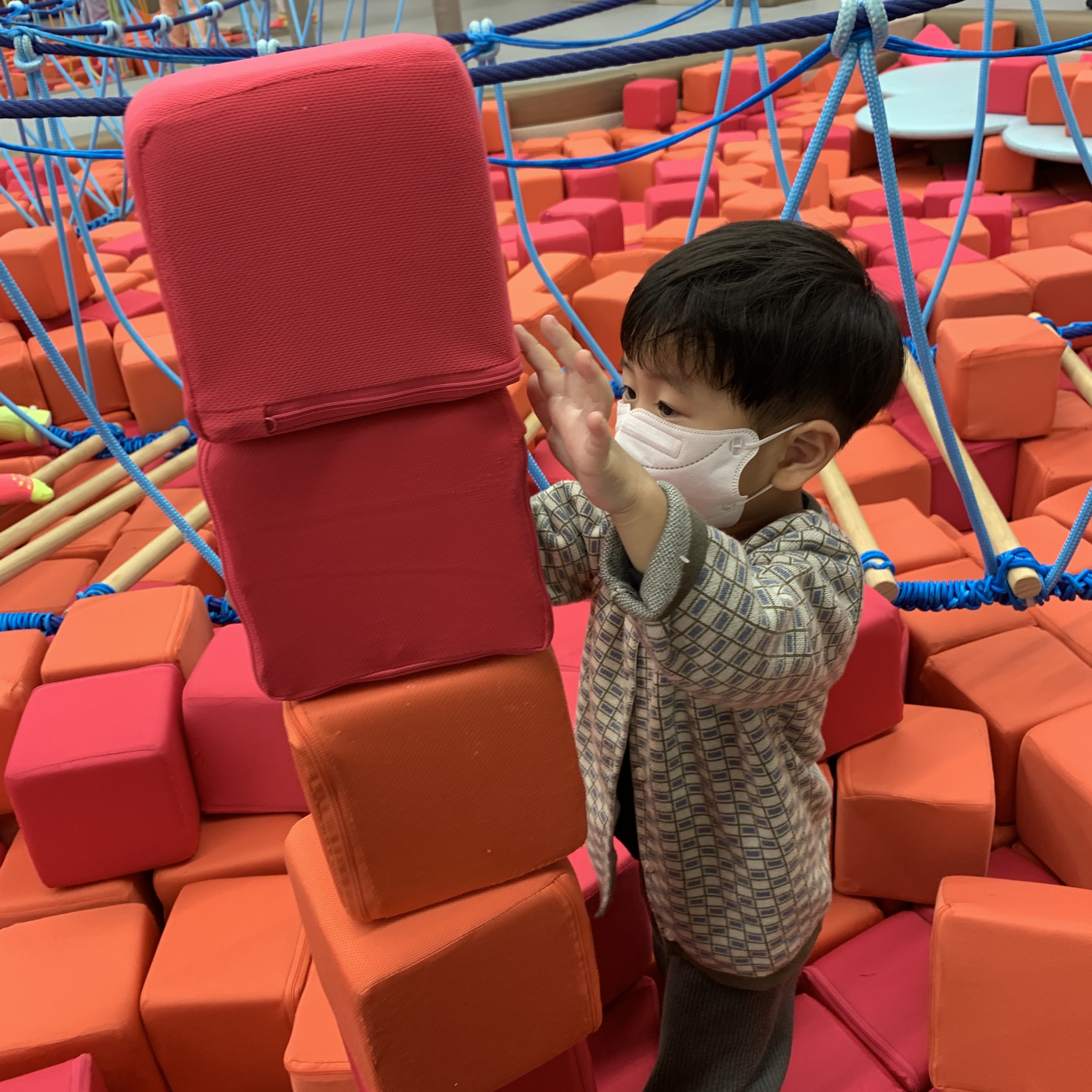 이곳은 빨간 블록들로 가들차 있는 공간이다. 저 빨간 블록은 쿠션으로 되어있어 놀기 좋다. 중간에 징검다리, 투명다리, 정글짐들이 숨어있어서 신나게 놀 수 있다.