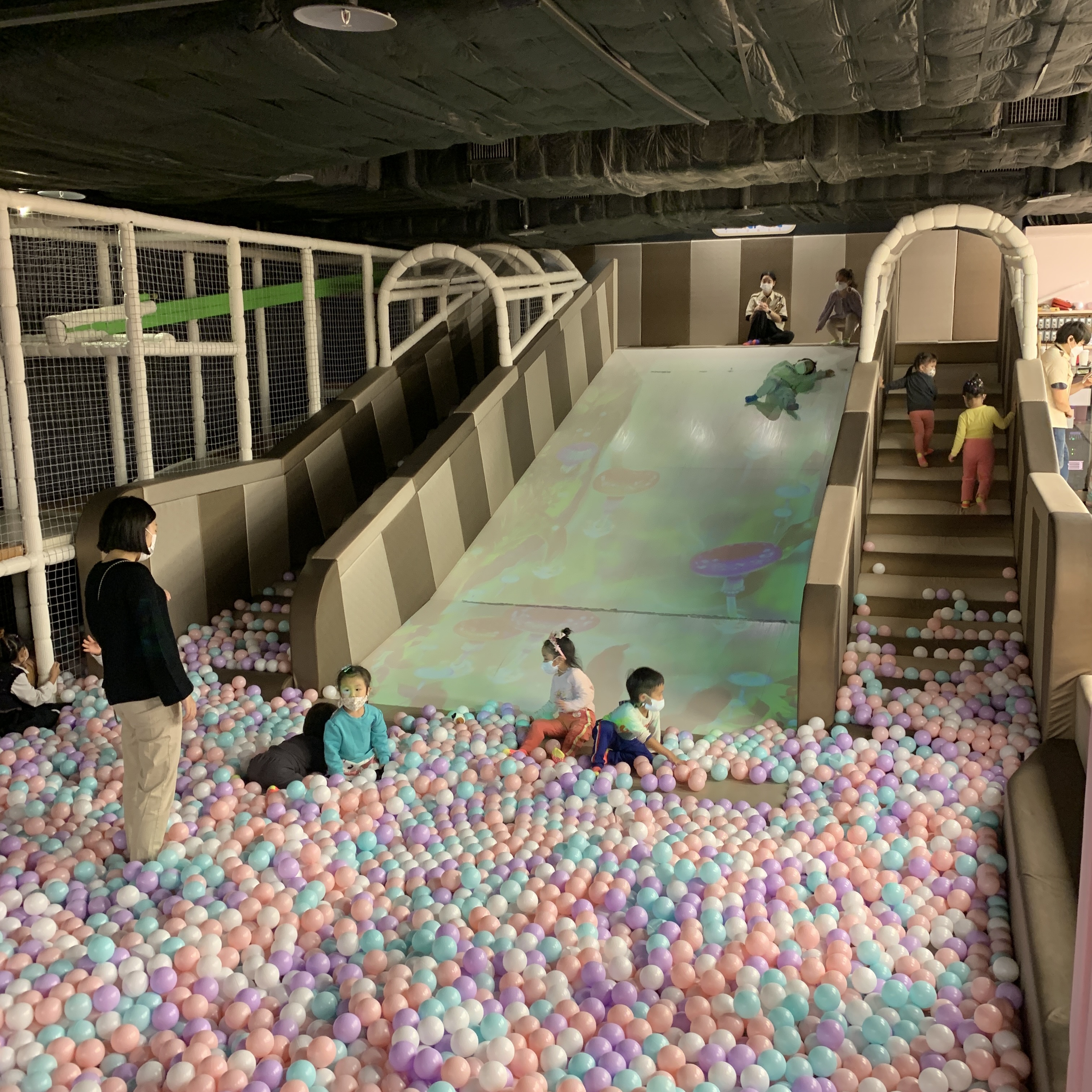 대형 미끄럼틀. 걸어서 올라가는데 계단이 스폰지로 돼어있어 푹신푹신하다. 미끄럼틀 경사로는 완만하고 아래쪽은 볼풀들로 가득차있어서 아이들이 다칠 우려가 없어보인다. 걱정 없이 혼자 태워도 된다