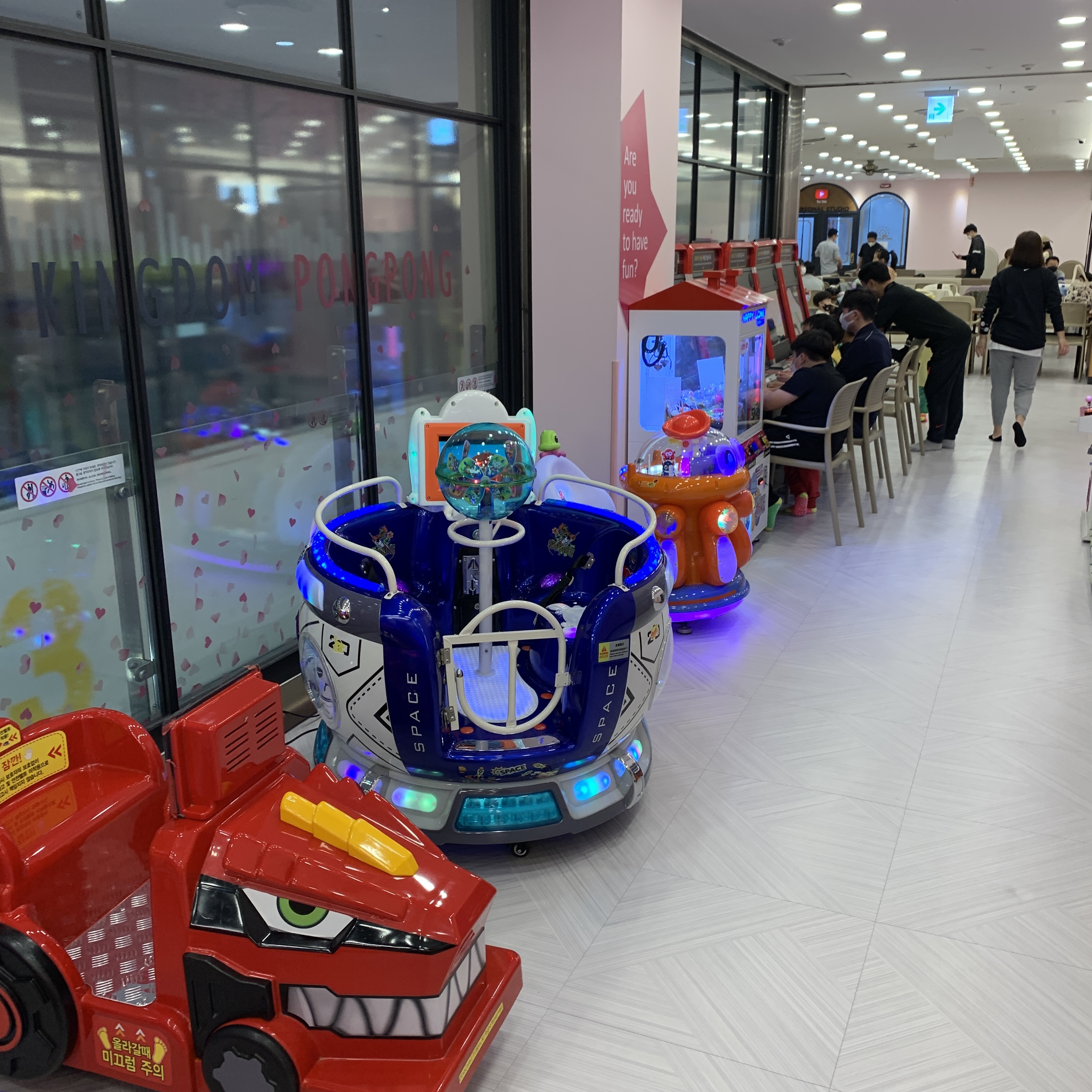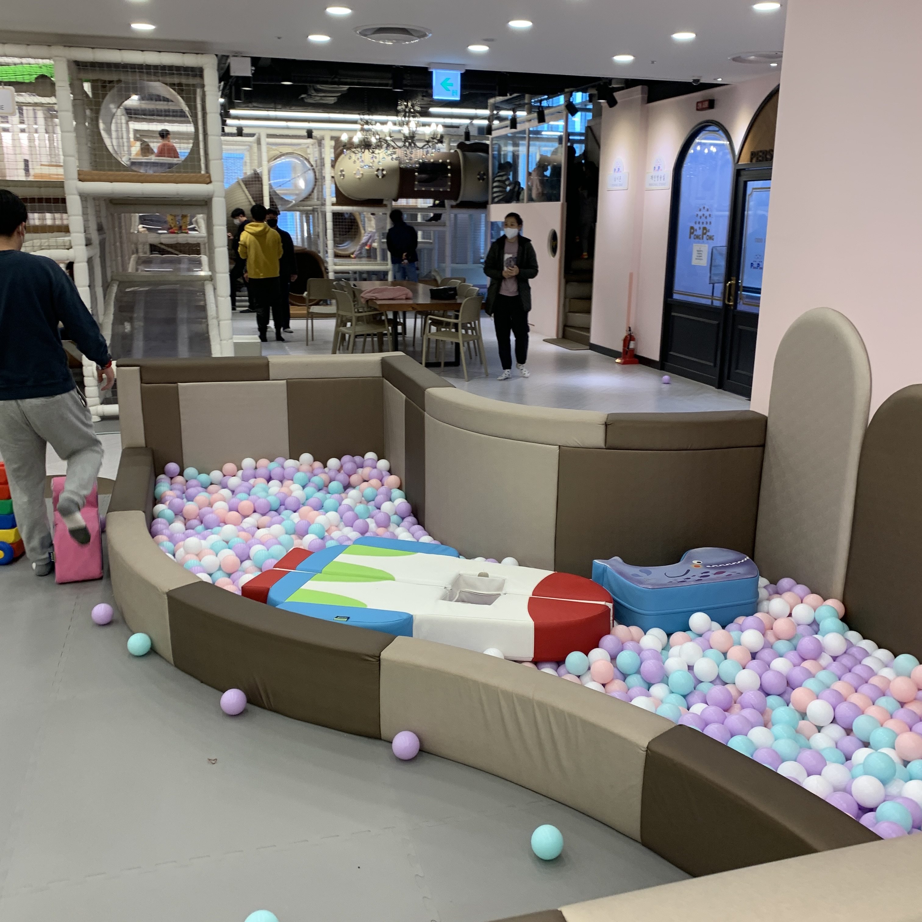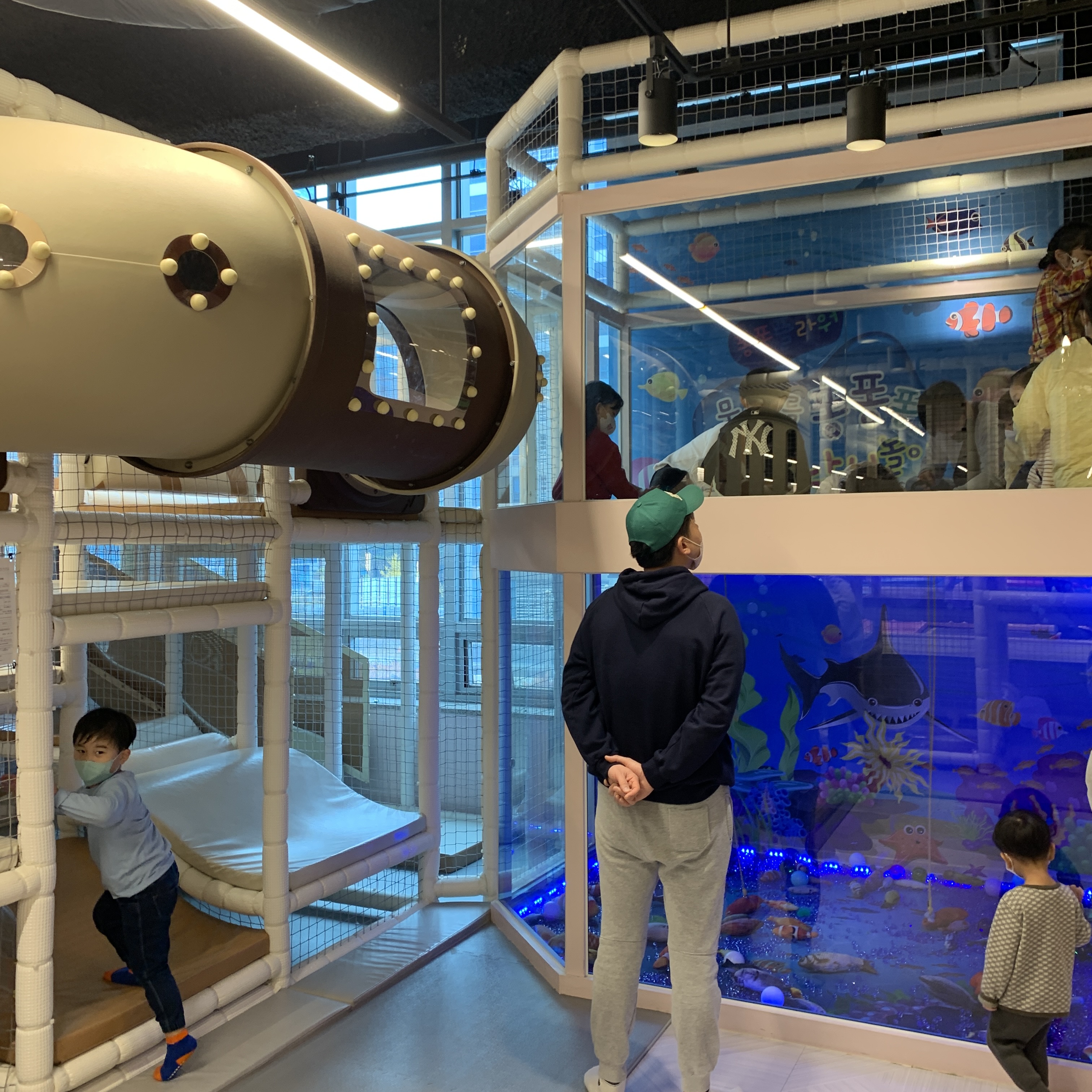 아이들이 놀 수 있는 대형 실내 4층 놀이터. 안에 미끄럼틀도 있고, 구름다리, 장애물이 있다. 아들이랑 같이 놀려고 들어갔는데 성인, 특히 아빠들에게는 안에서 돌아다니기에는 너무 좁다. 몇번 돌아다니다가 몸이 불편해서 안들어갔다. 그리고 사진 우측에는 어린이 낚시존이 있다. 1층에는 여러가지 바다생물들이 놓여져있고 2층에서 낚시대로 잡아올리는 놀이다. 서로 좌석이 붙어있어 주변에 갖다 대기만 하면 붙는다.