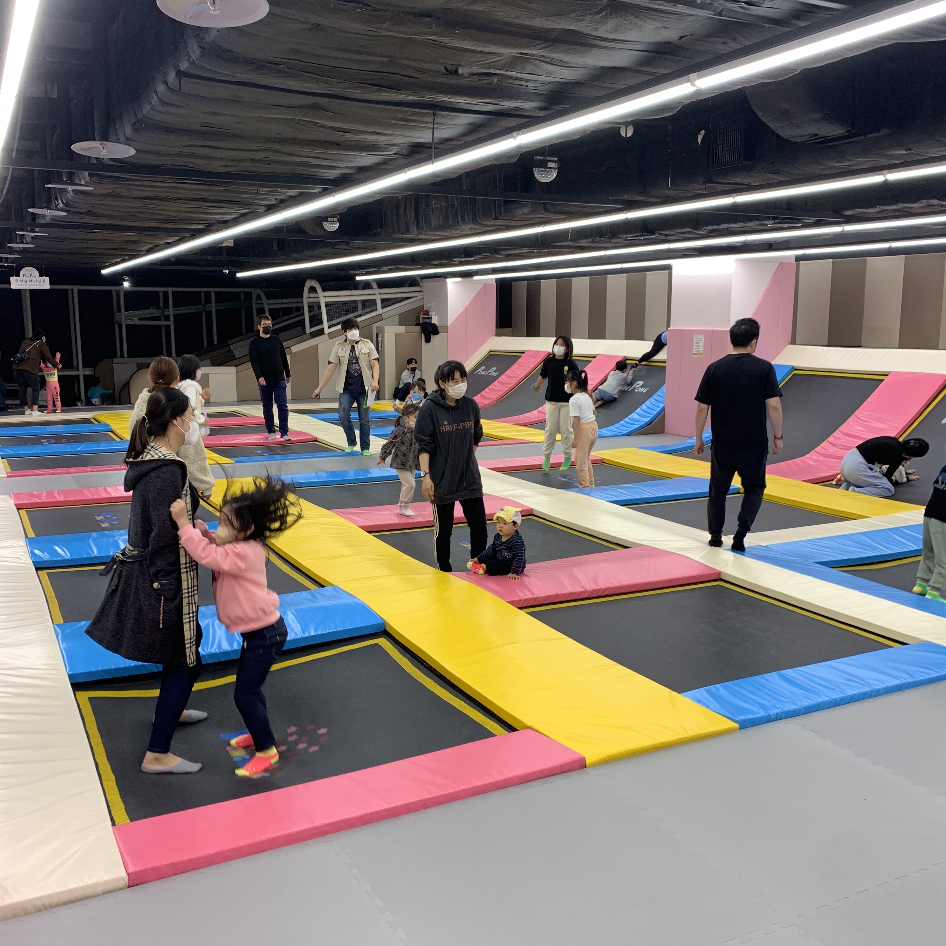그리고 한번씩 트램플린존에서 파티가 열린다. 직원분들에 파티 전 안내 방송을 하면 어린이들이 모여들고, 곧 파티가 시작된다. 불이 꺼지고 싸이키 조명과 연기가 나와 사진으로 보면 어린이 클럽같다. 노래는 팝송이 나온다.