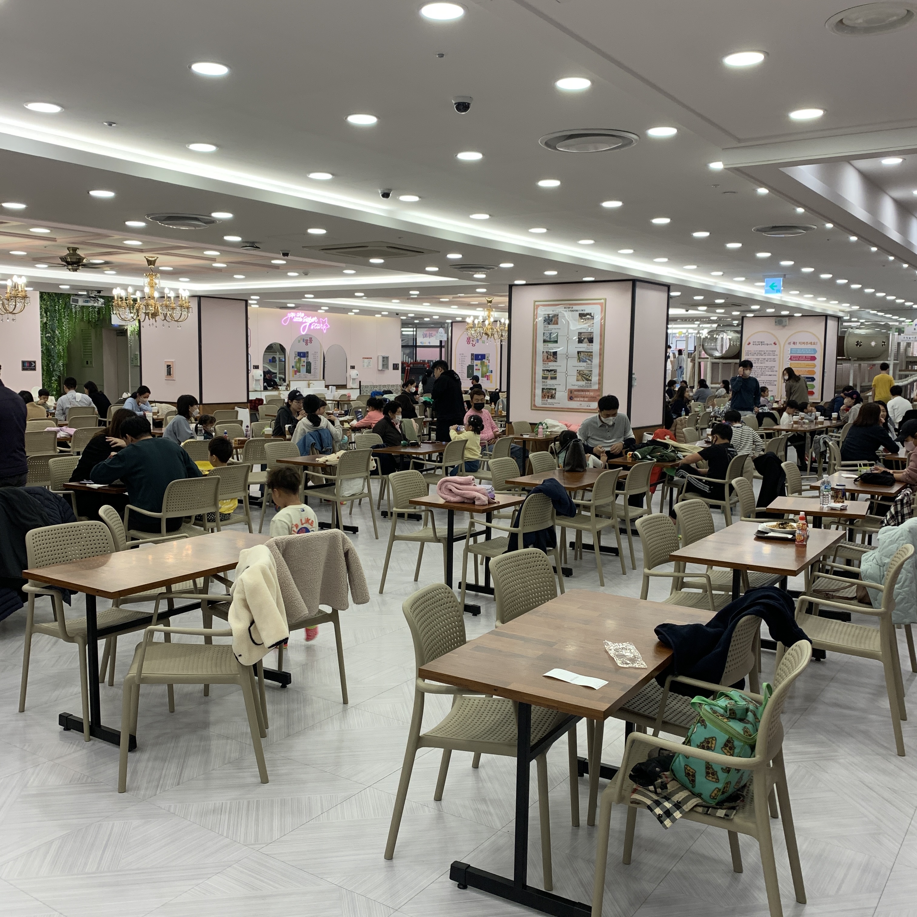 퐁퐁플라워 가산센터 내부 식사공간이다. 규모가 크고 좌석수가 많고 놀이시설 중간중간마다 앉아서 먹을 수 있는 간이 좌석들이 많이 구비되어 있어 자리가 없어서 앉지 못해 기다릴 필요는 없다.