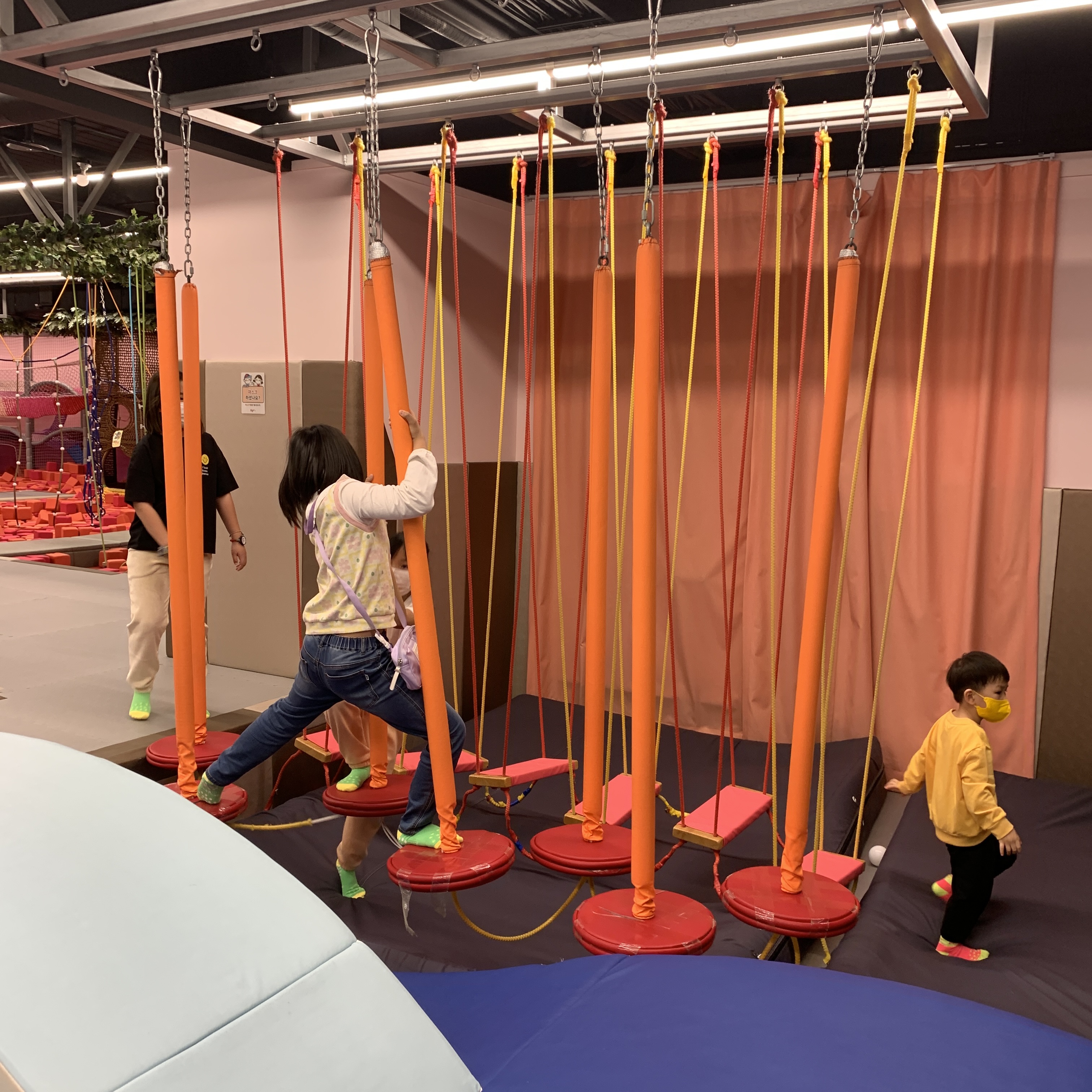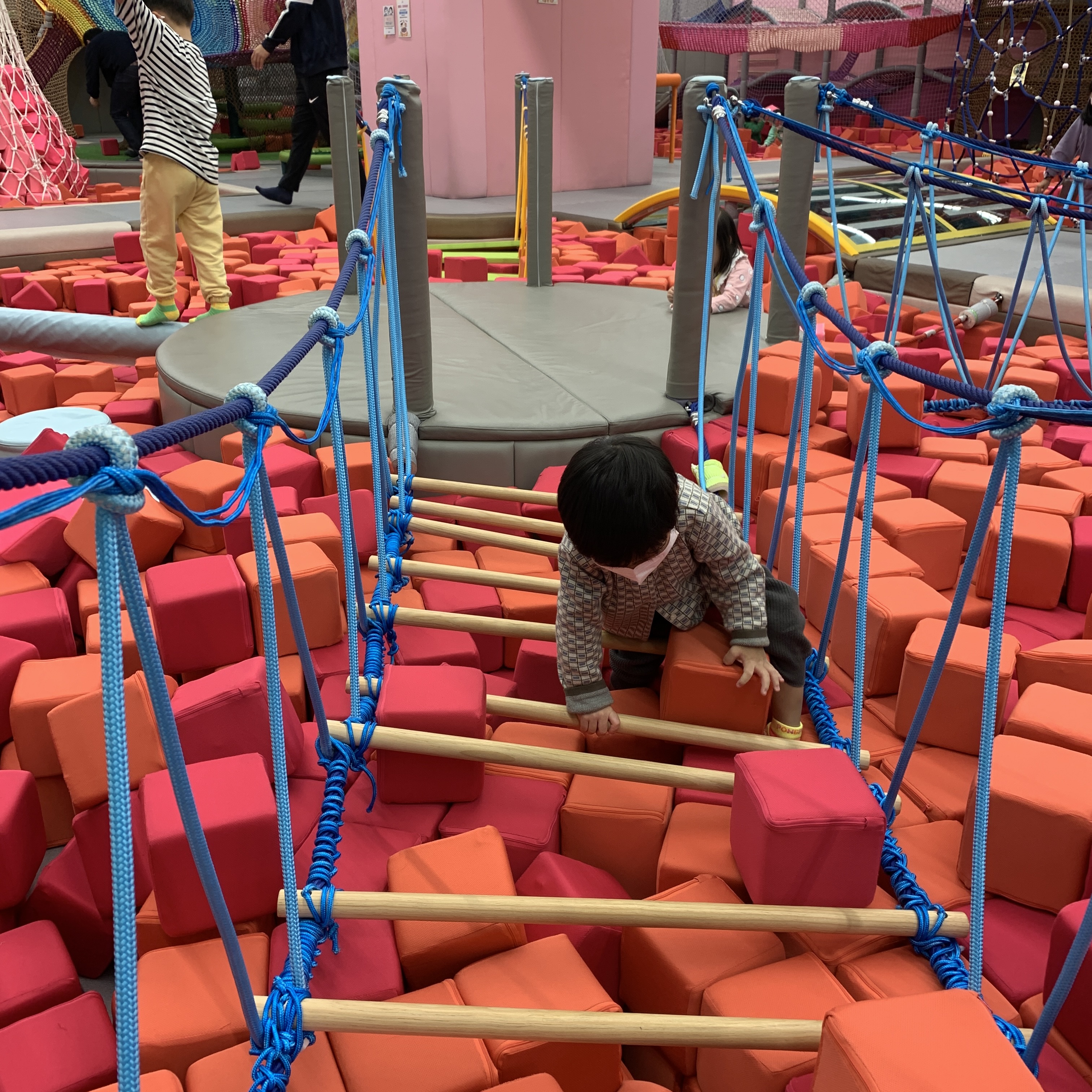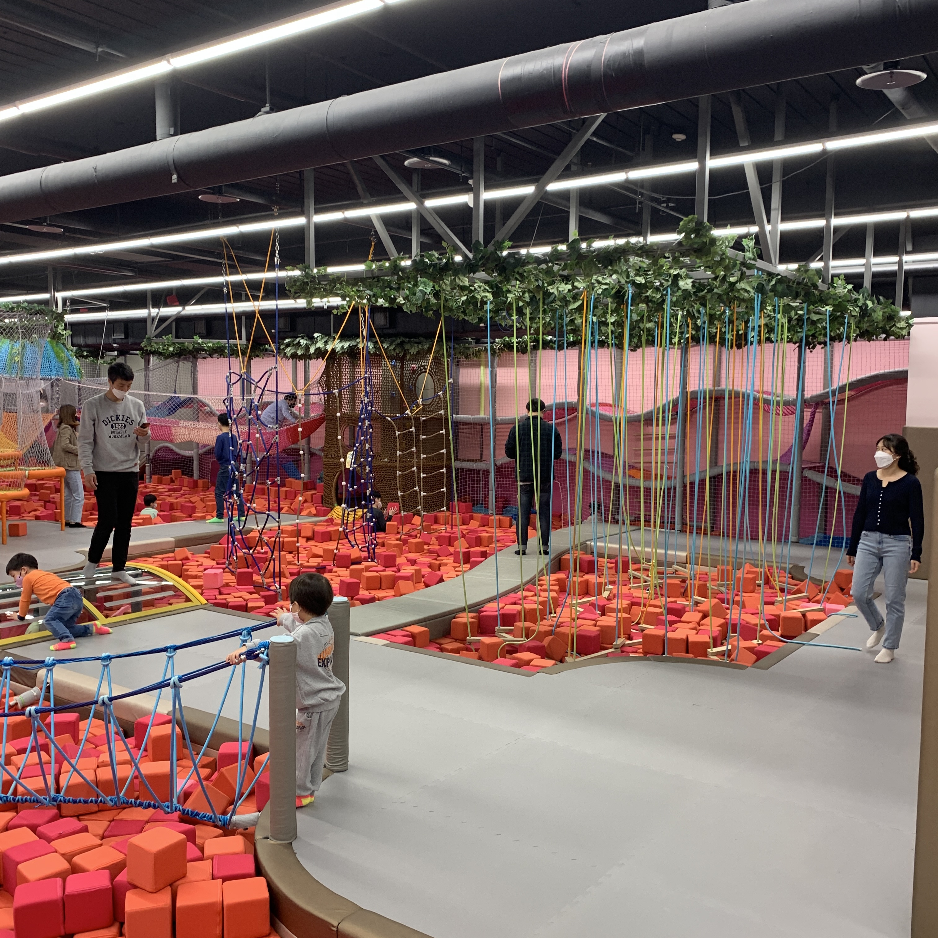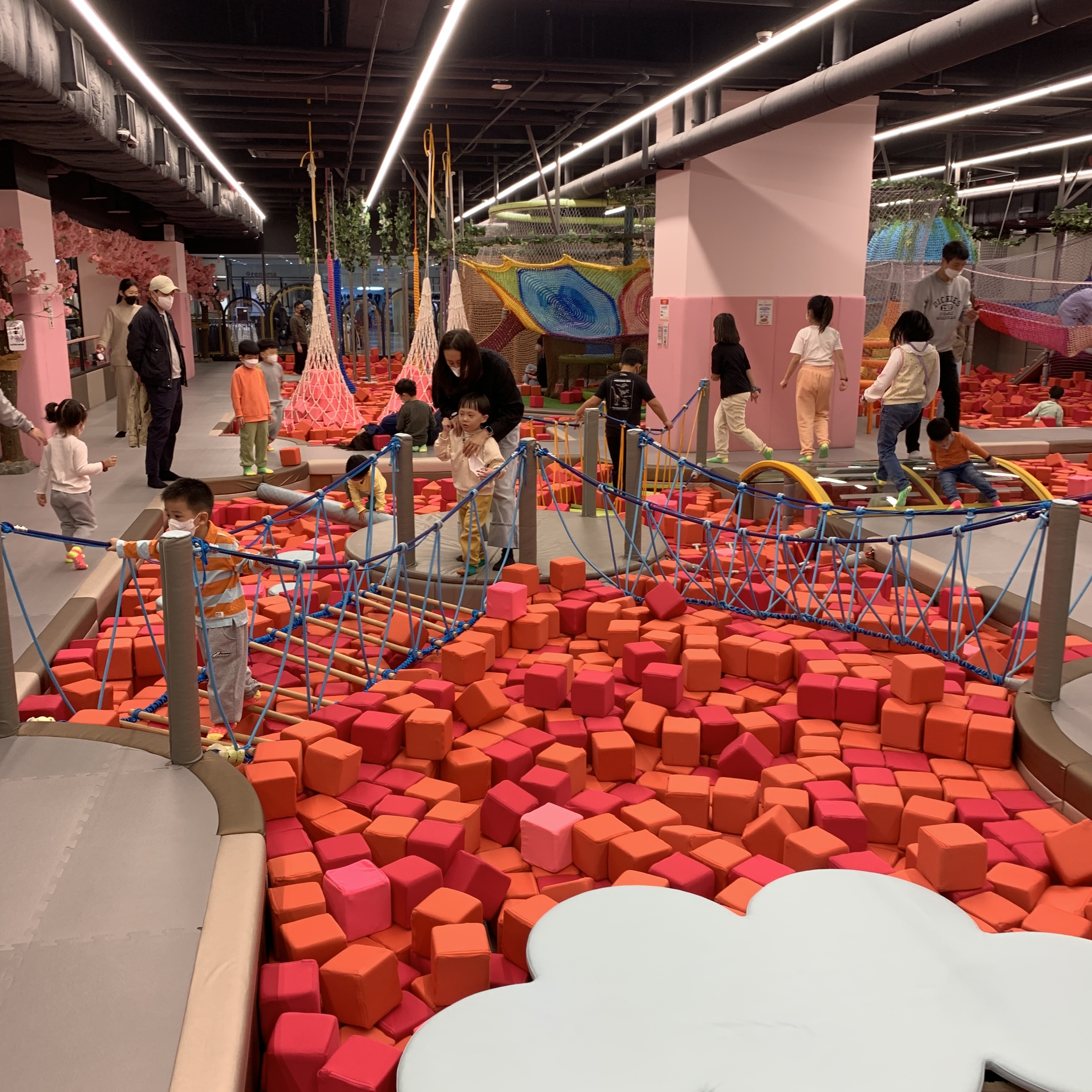 이곳은 빨간 블록들로 가들차 있는 공간이다. 저 빨간 블록은 쿠션으로 되어있어 놀기 좋다. 중간에 징검다리, 투명다리, 정글짐들이 숨어있어서 신나게 놀 수 있다.