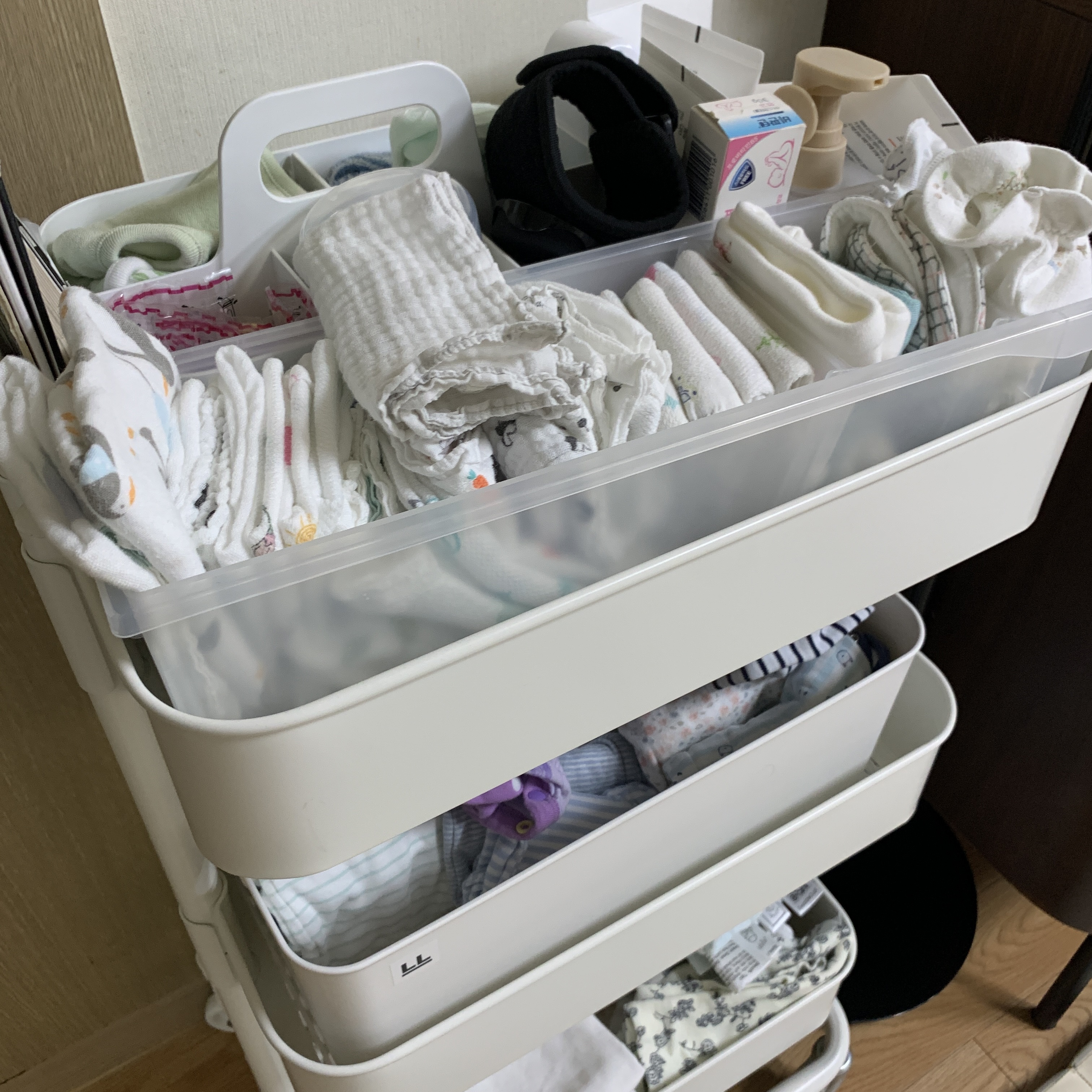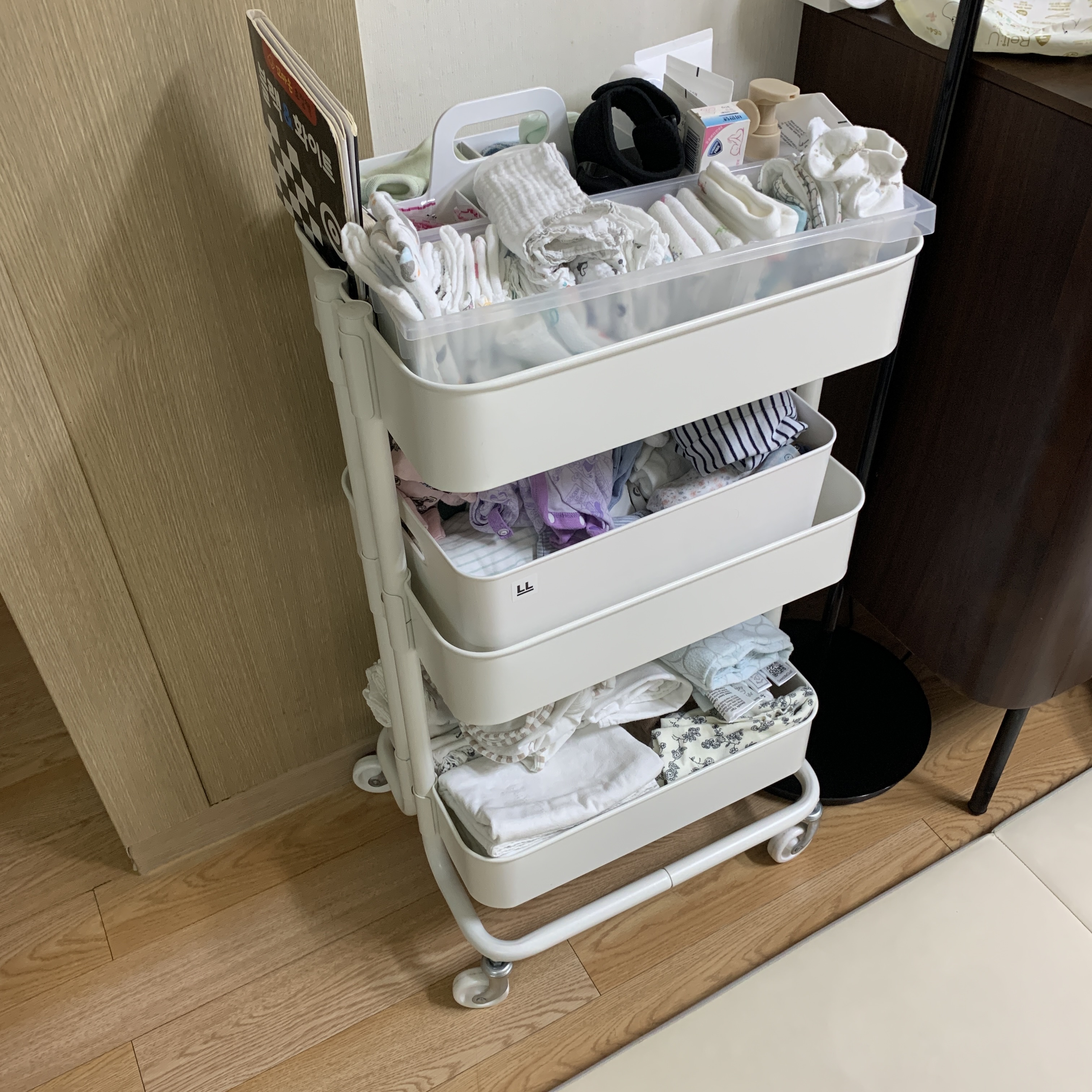 집에서 육아를 하면 금방금방 소모되는 품목들이 있다. 대표적으로 기저귀, 물티슈, 손수건, 아기 옷 등등... 이런 것들은 옷장이나 고정된 장소에 있다기보다는 그때그때 필요할 때마다 갖다 써야 하기에 트롤리를 사용하면 손쉽게 정리하고 이용이 가능하다. 대표적으로 이케아 트롤리가 있는데 3단으로 구성되어 있고 바퀴가 달려있어 간단한 육아에 필요한 용품들을 수납할 수 있다.