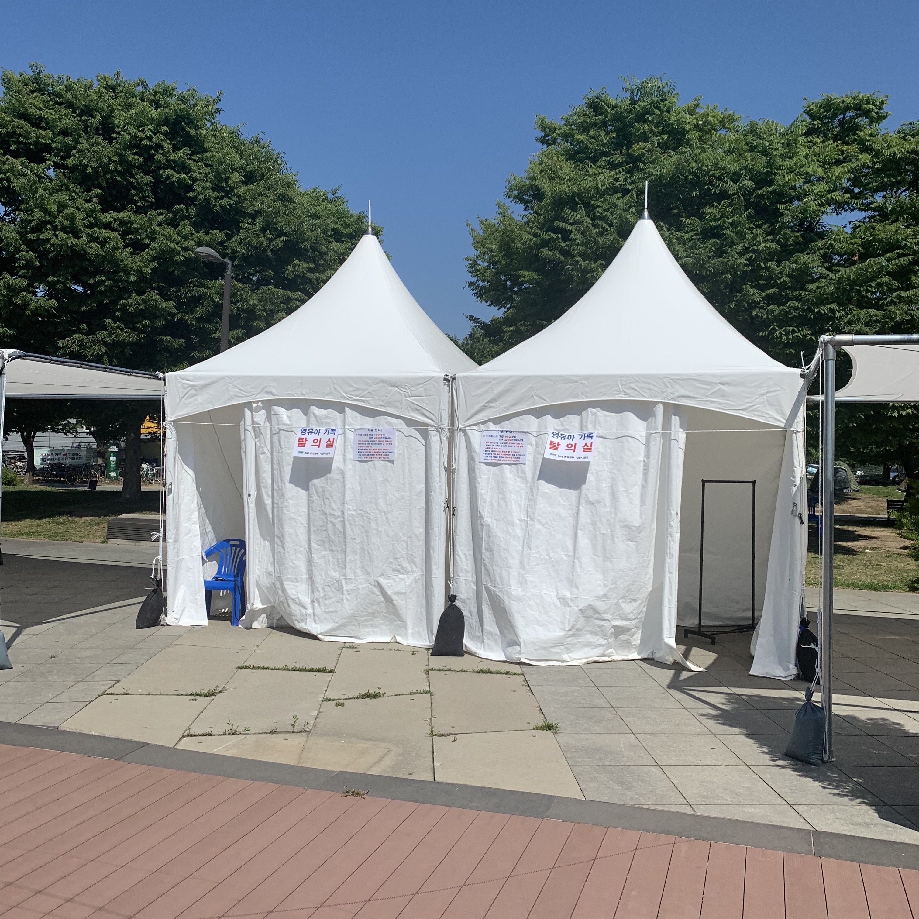 그늘막에 자리를 잡았다. 앞쪽에는 자체 그늘막을 만들어놓고 편하게 쉴 수 있는 공간도 있다. 이곳에서는 그늘막이 금지된다.