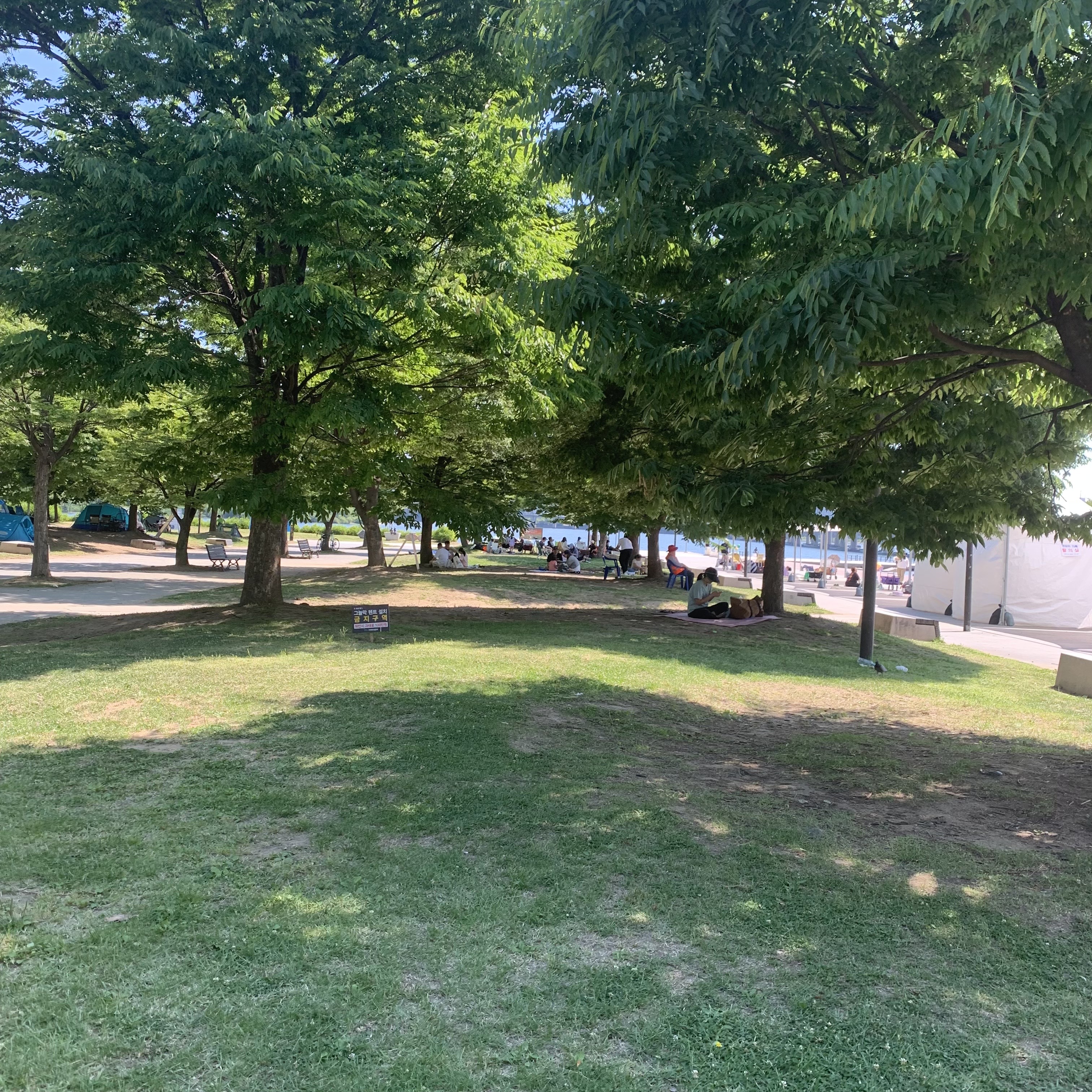 물빛광장으로 들어오면 쉴 수 있는 공간들이 있는데 아무 장소에나 그늘막을 설치할 수 있는 게 아니다. 돗자리 설치할 수 있는 장소와 그늘막 설치할 수 있는 장소가 별도로 있으니 확인하고 가자.