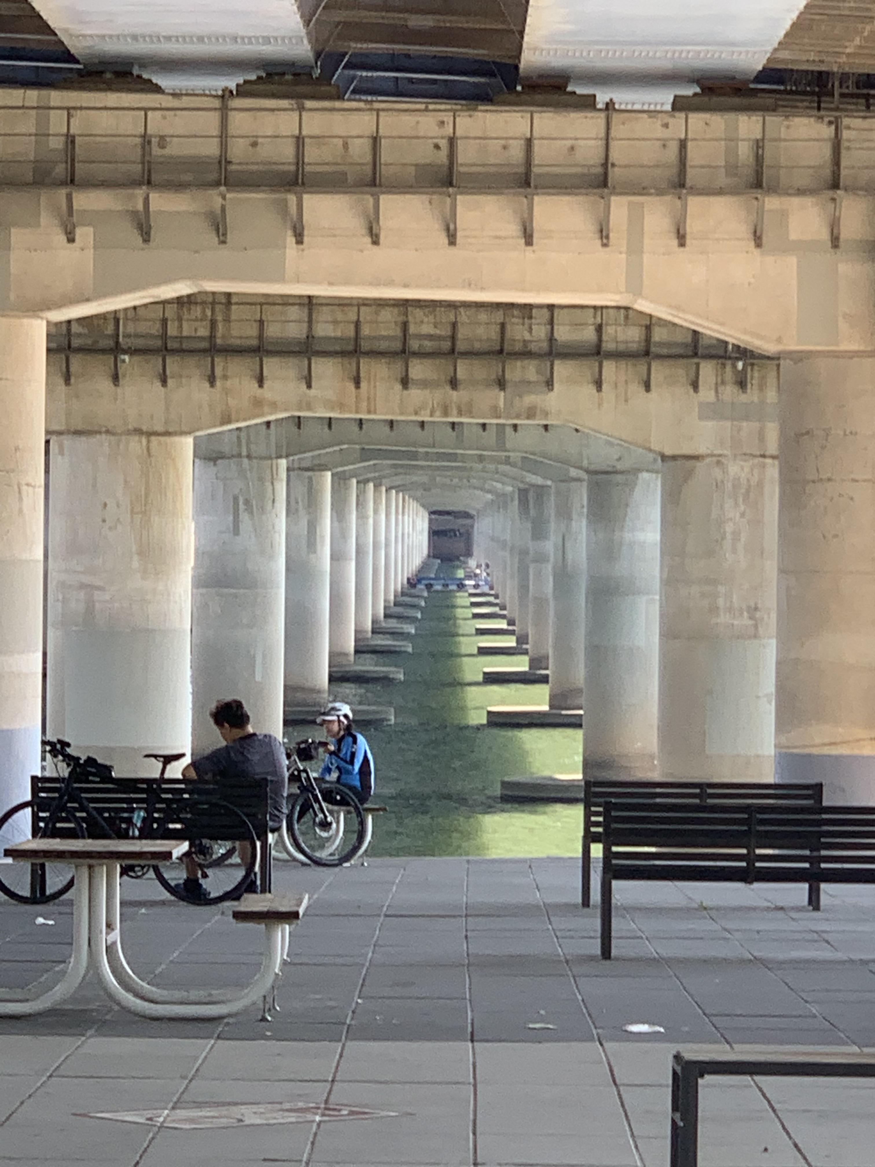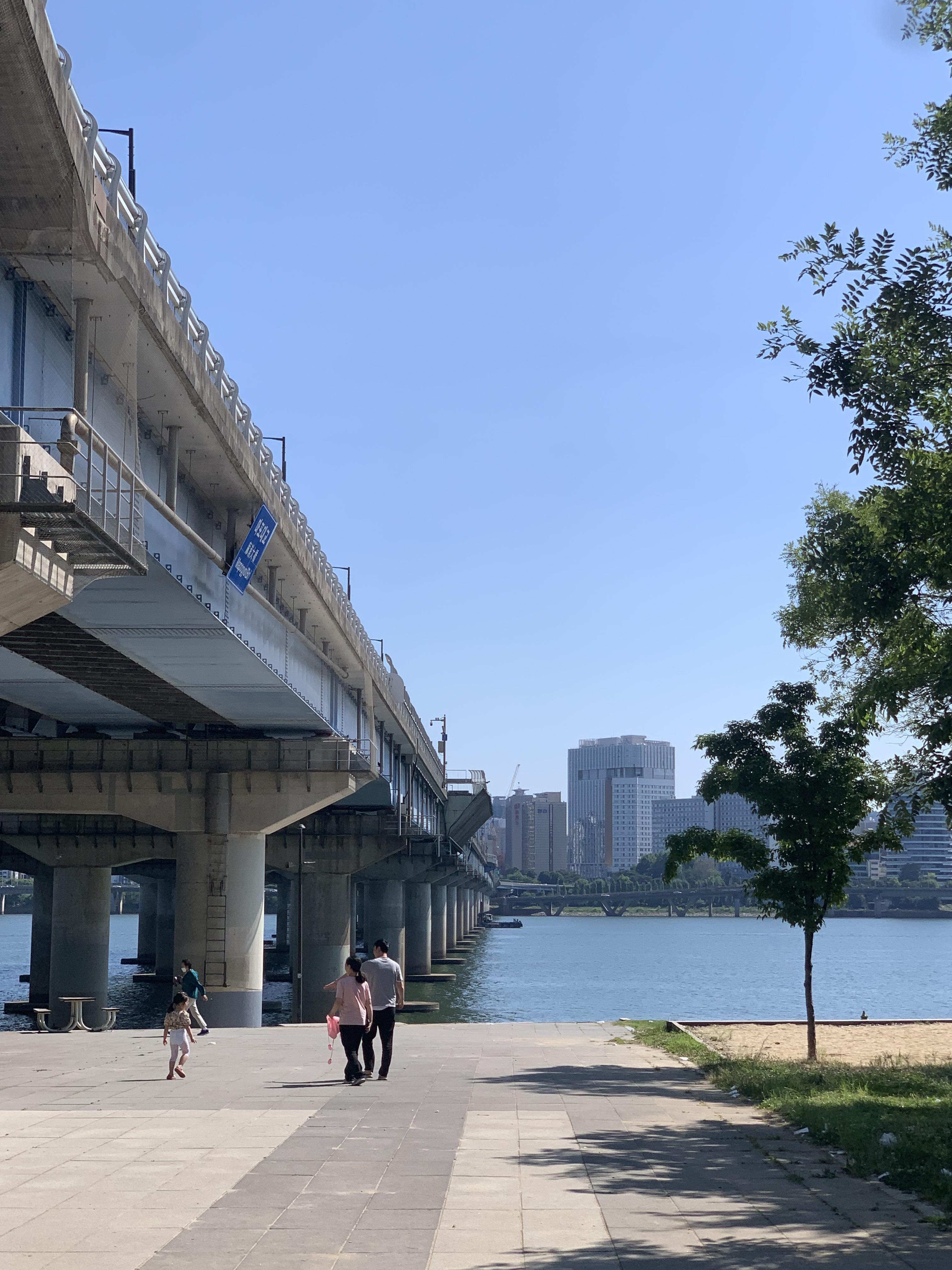 주차장에서 마포대교 아래로 지나가면 물빛광장으로 이어진다. 마포대교 아래도 물이 흐르고, 자연 그늘이 형성되어 더운 날 이곳에서 놀아도 충분히 좋을 듯하다. 하지만 처음 와봤기에 그늘막치는 장소까지 이동해 본다.