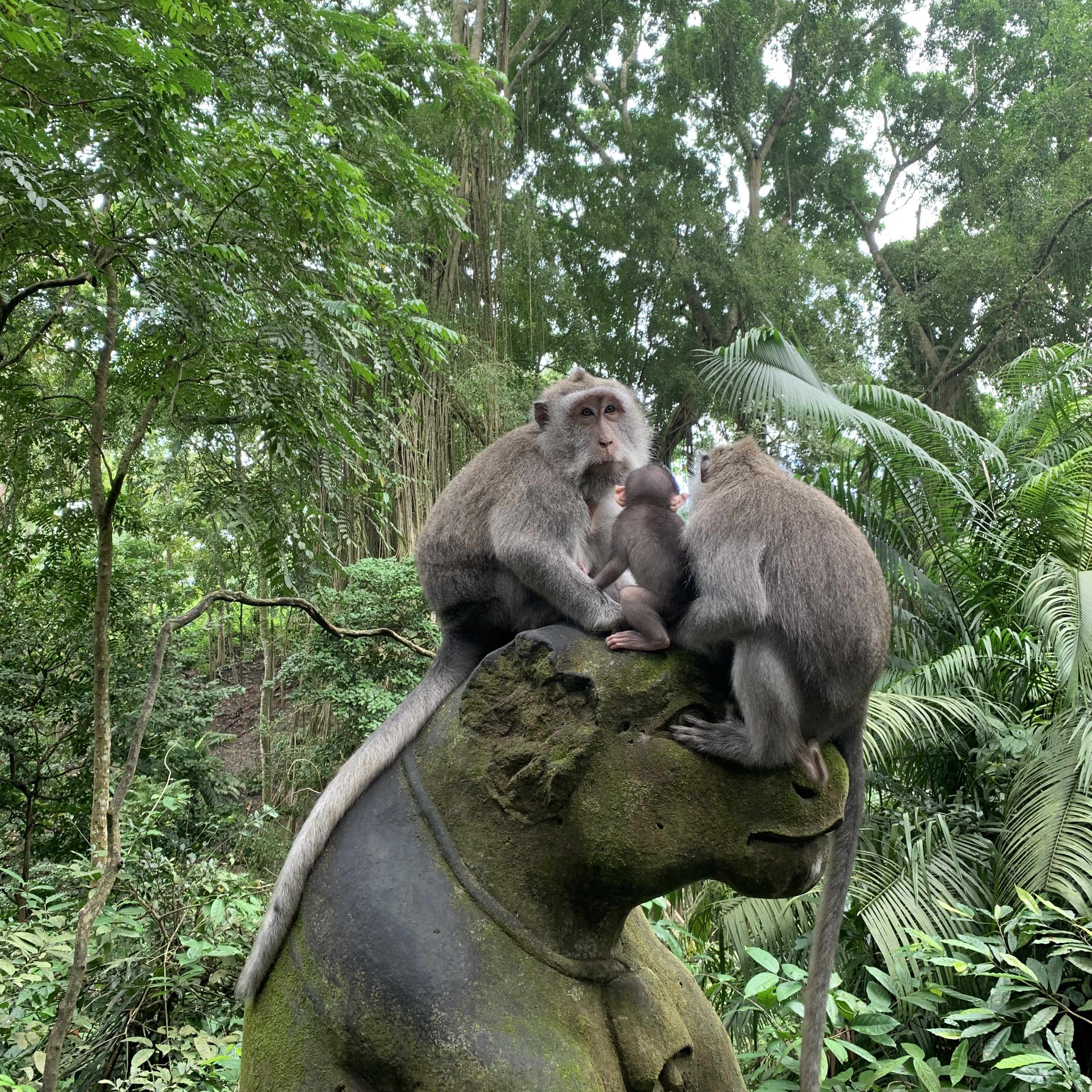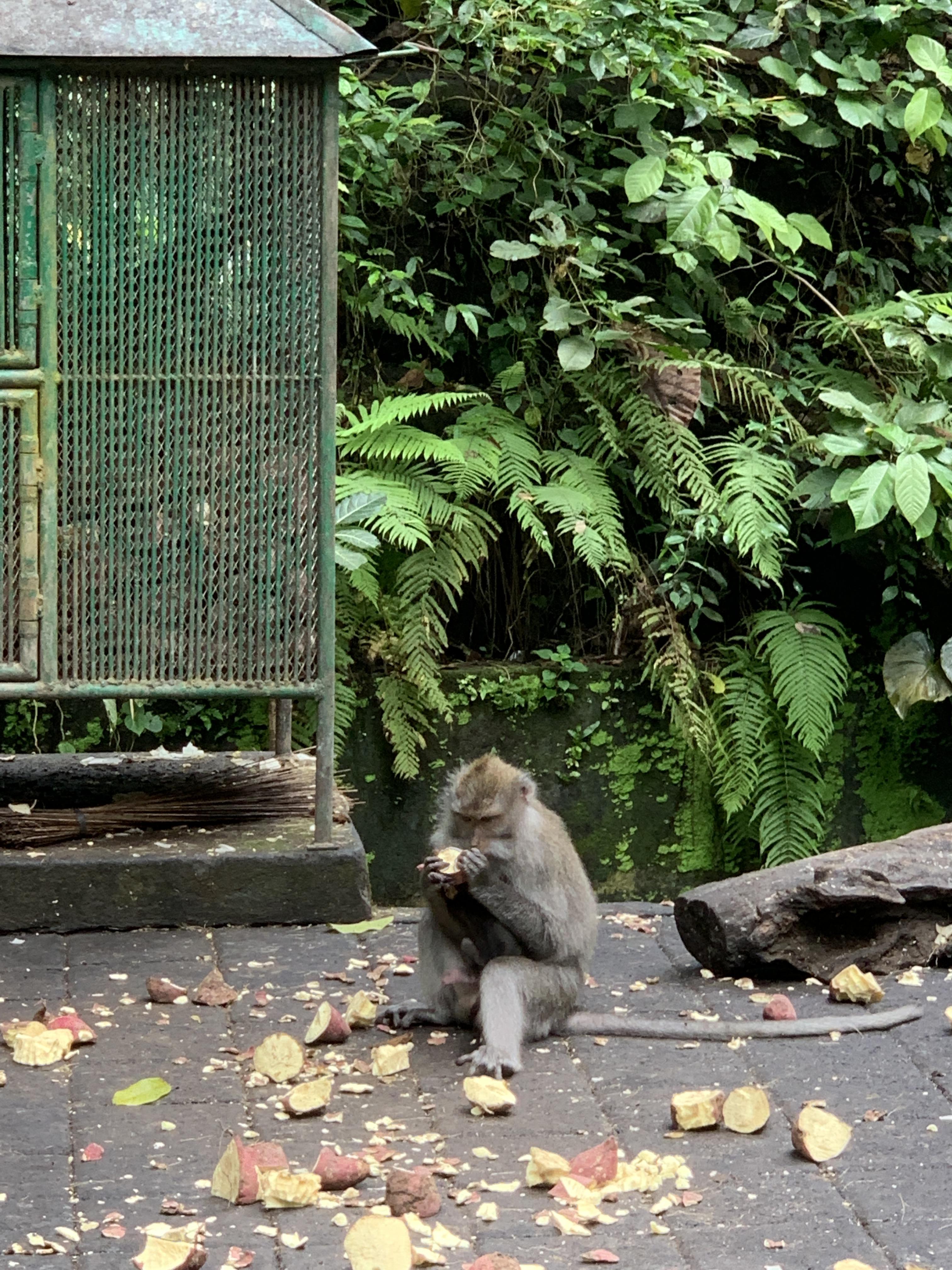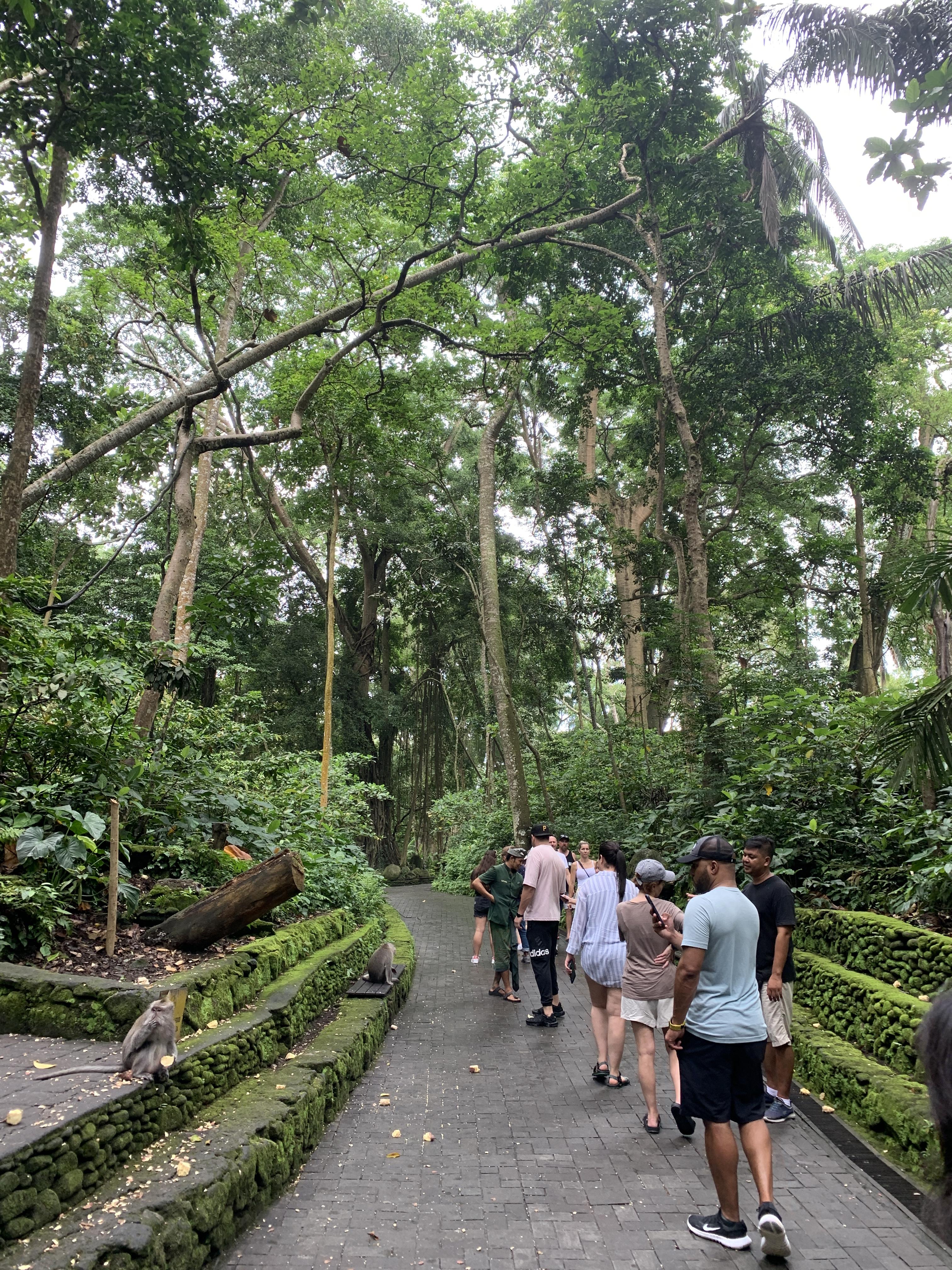 우붓에서 가장 인기 있는 관광명소 중 하나이다. 말 그대로 원숭이 숲. 수십 년으로는 안 되고 수백 년은 돼 보이는 거대하고 울창한 숲 속에 원숭이들이 살고 있다. 동물원에서 볼 수 있는 유리 건너편 원숭이가 아니라, 가림막이 없는 바로 앞에서 아니 직접 몸으로 교감할 수 있는 장소이다.