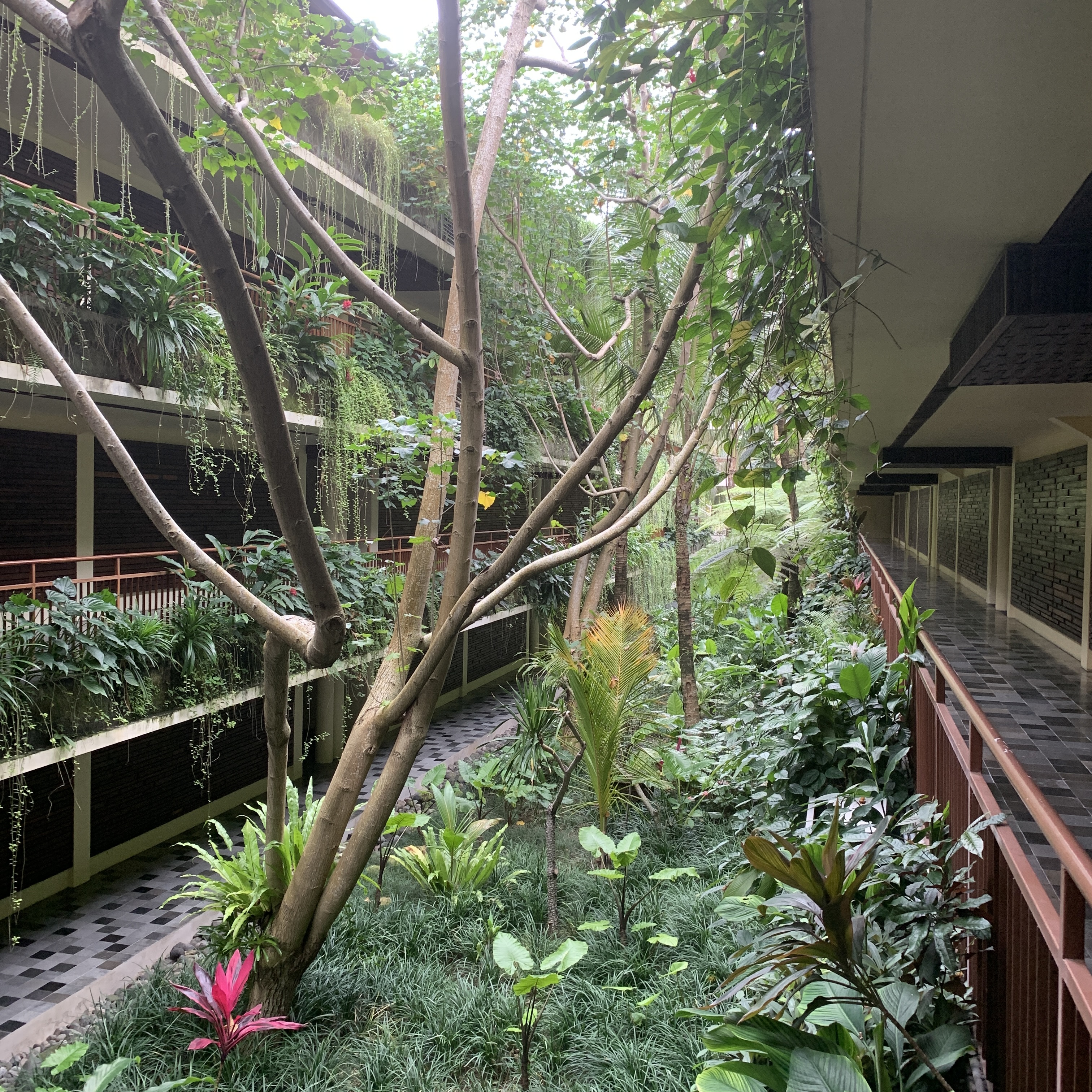 체크인을 하고 객실로 가는 모습. 호텔 중앙부는 오픈되어 있고, 중앙부는 대형 나무들과 자연 친환경적인 식물들로 오랜 시간 동안 자리 잡아서 우붓이라는 장소와 참 잘 어울린다.
