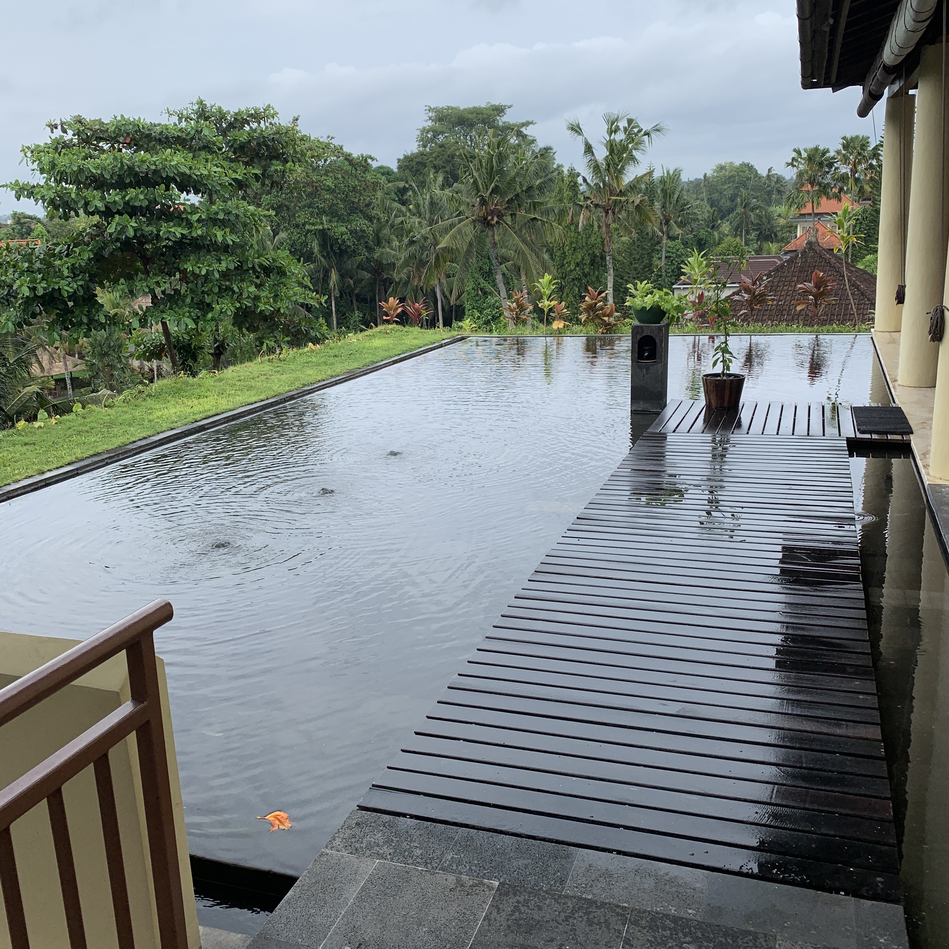 코마네카 엣 라사사양의 수영장. 우리가 생각하던 우붓의 수영장의 모습과 딱 맞아떨어져서 좋았다. 절벽 수영장과 푸른푸른 나무들이 잘 어울린다. 수온은 처음에 발을 담갔을 때 차갑지만, 막상 들어가면 처음 들어가는 순간만 차갑고 나머지는 괜찮다. 5살 아들과 한 시간 넘게 매일같이 수영했다. 사람이 없어서 온전히 편하게 즐길 수 있다.