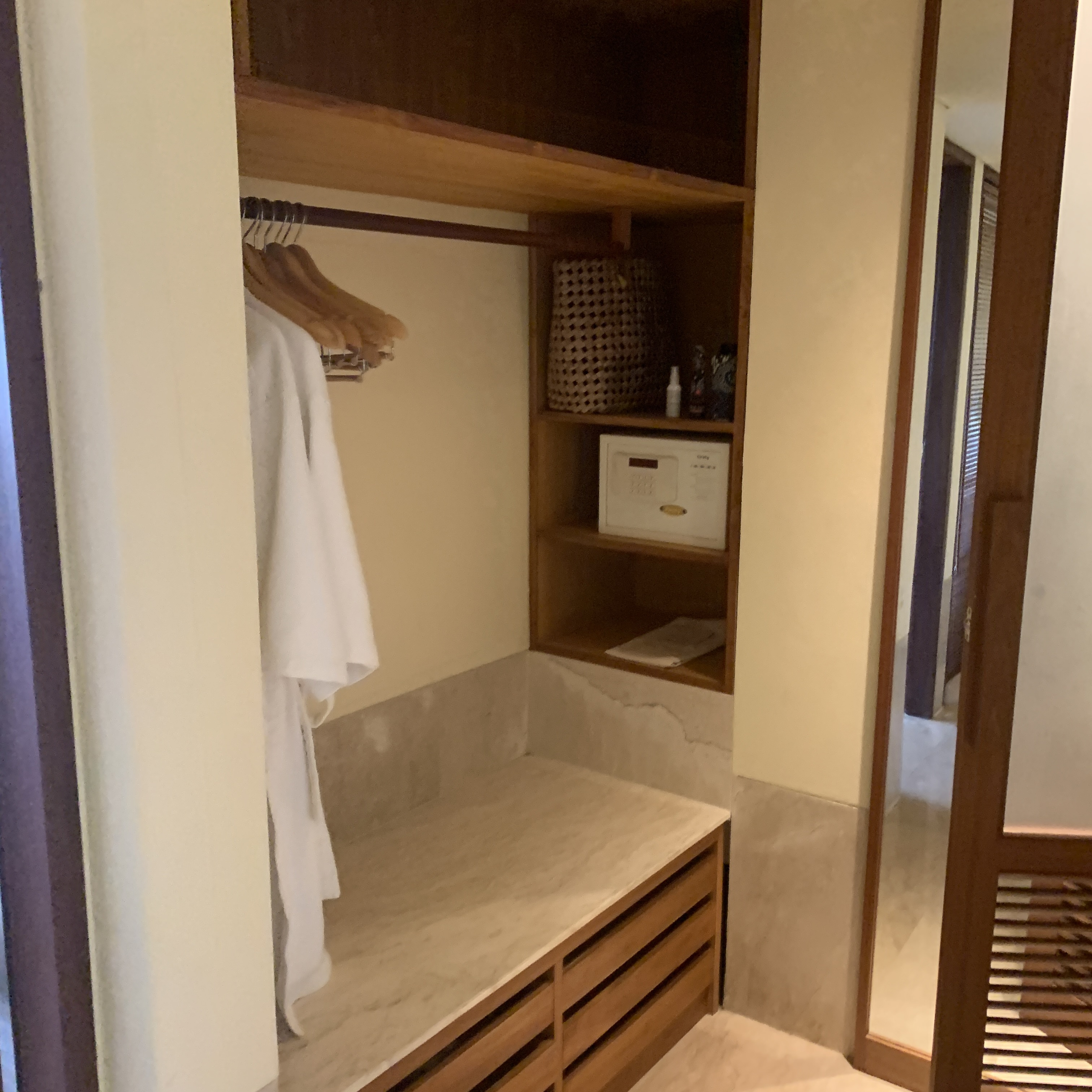 드레스룸은 별도로 없고, 욕실 내 짐 놓을 공간과 금고, 수납공간들이 마련되어 있다. 기본 슬리퍼와 수영장 가방이 라탄으로 만들어져서 인테리어 소품으로 괜찮다. 다만 팔진 않는다