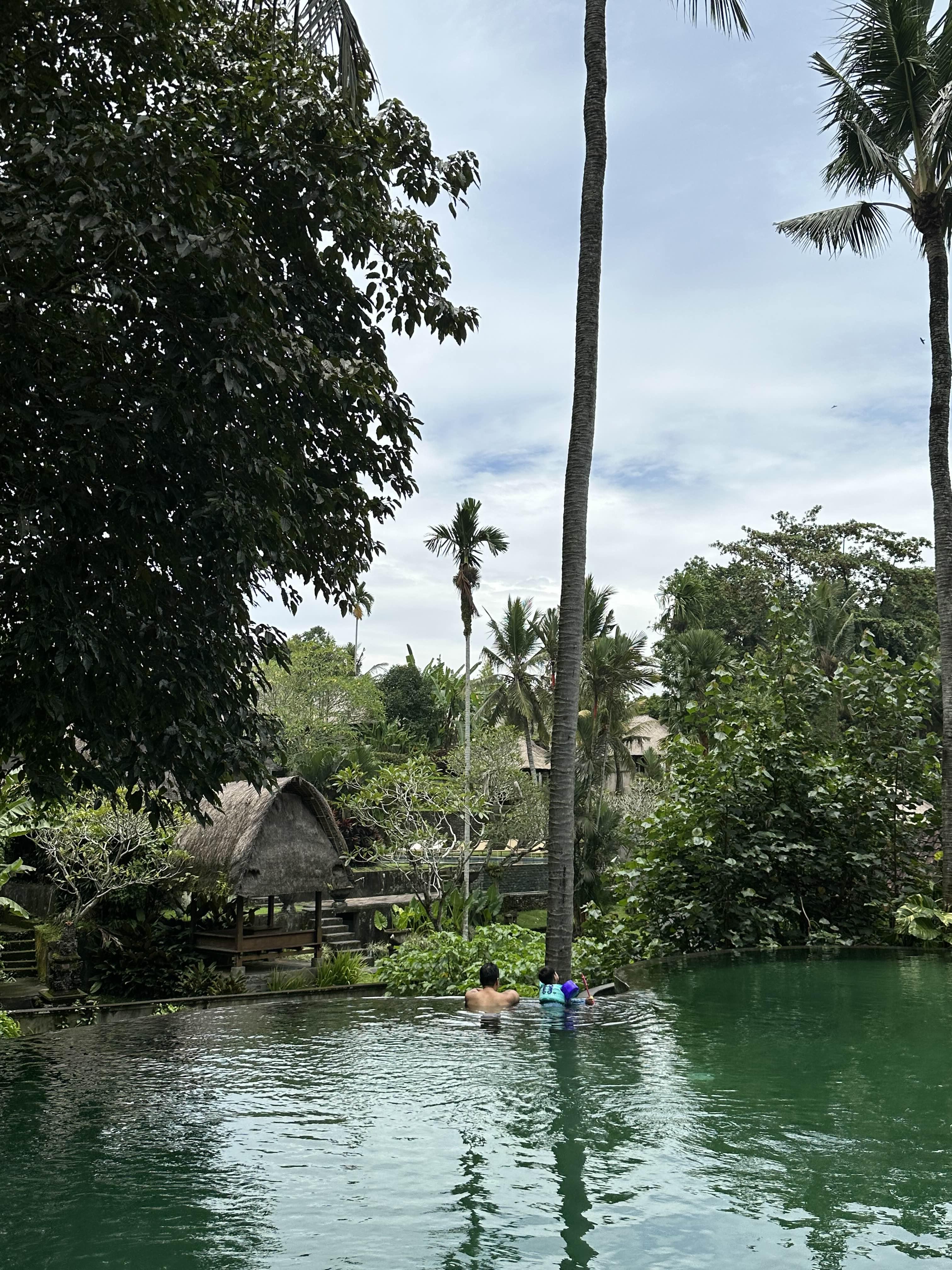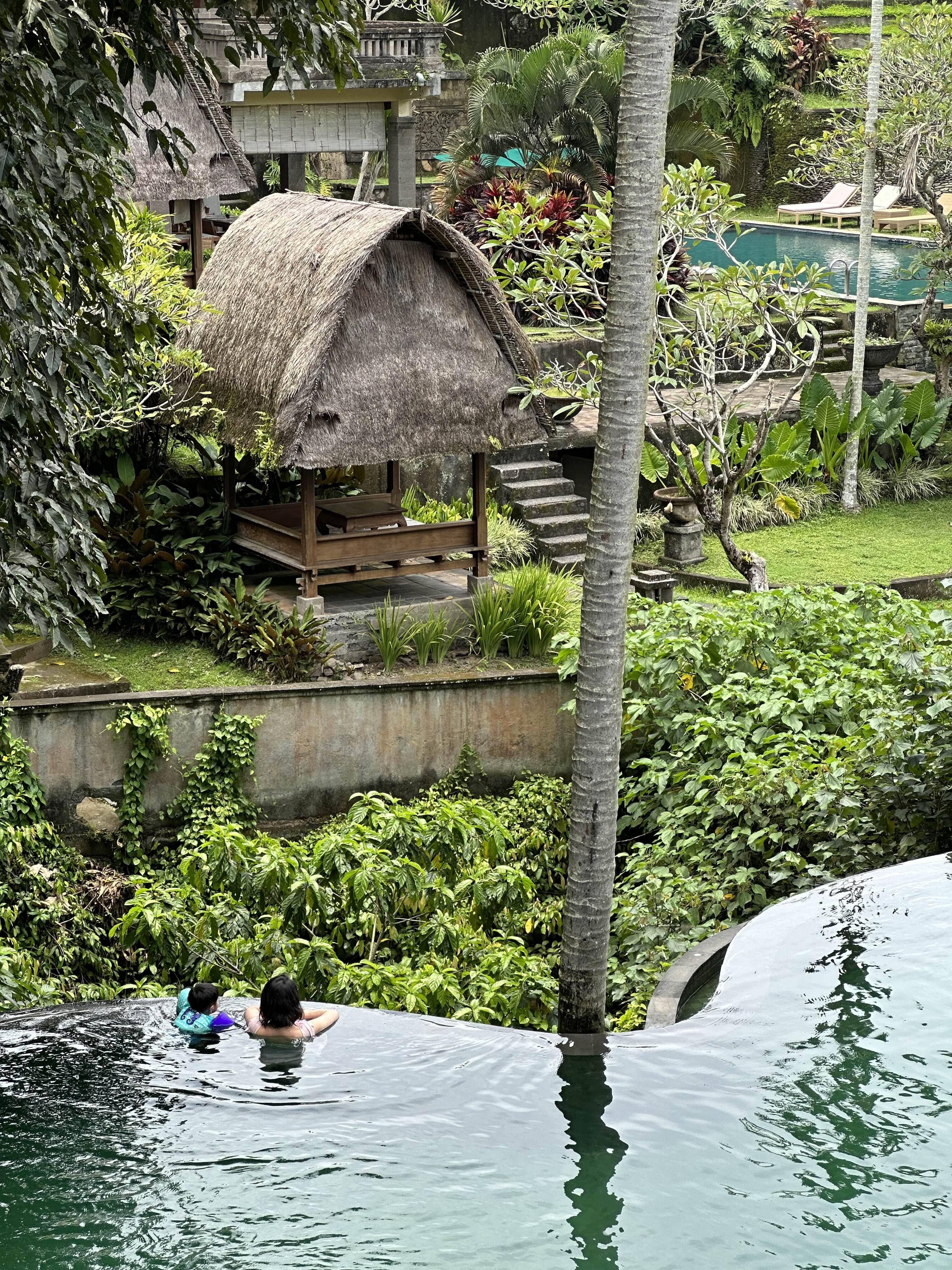 코마네카 엣 라사사양의 수영장. 우리가 생각하던 우붓의 수영장의 모습과 딱 맞아떨어져서 좋았다. 절벽 수영장과 푸른푸른 나무들이 잘 어울린다. 수온은 처음에 발을 담갔을 때 차갑지만, 막상 들어가면 처음 들어가는 순간만 차갑고 나머지는 괜찮다. 5살 아들과 한 시간 넘게 매일같이 수영했다. 사람이 없어서 온전히 편하게 즐길 수 있다.