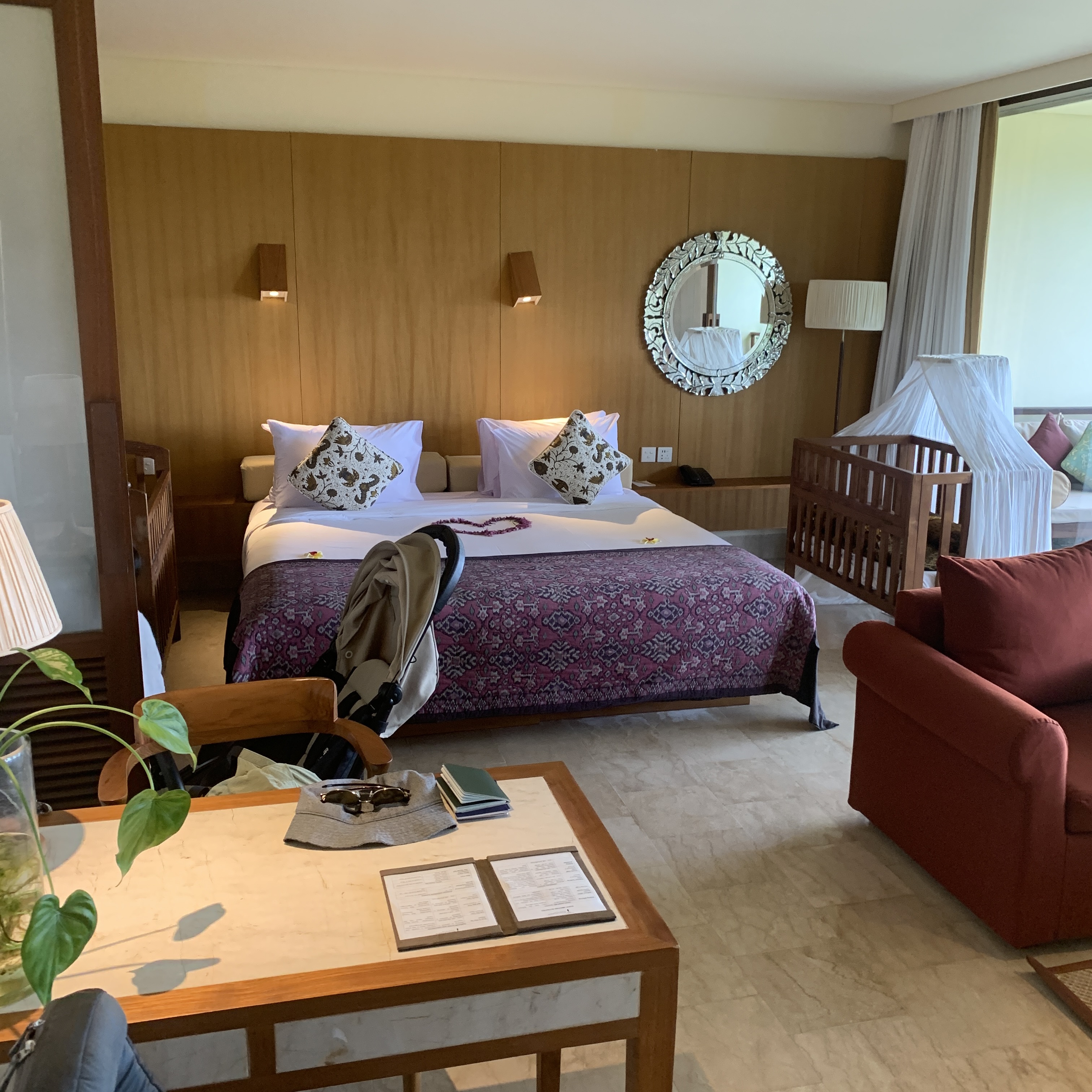 디럭스룸이다. 싱글베드 두개를 합쳐서 킹사이즈 침대로 만들어놨고, 식탁, 소파가 있다. 아기침대를 요청했는데, 두 개를 준비해 줘서 지내는 동안 아이들이 편하게 잤다.