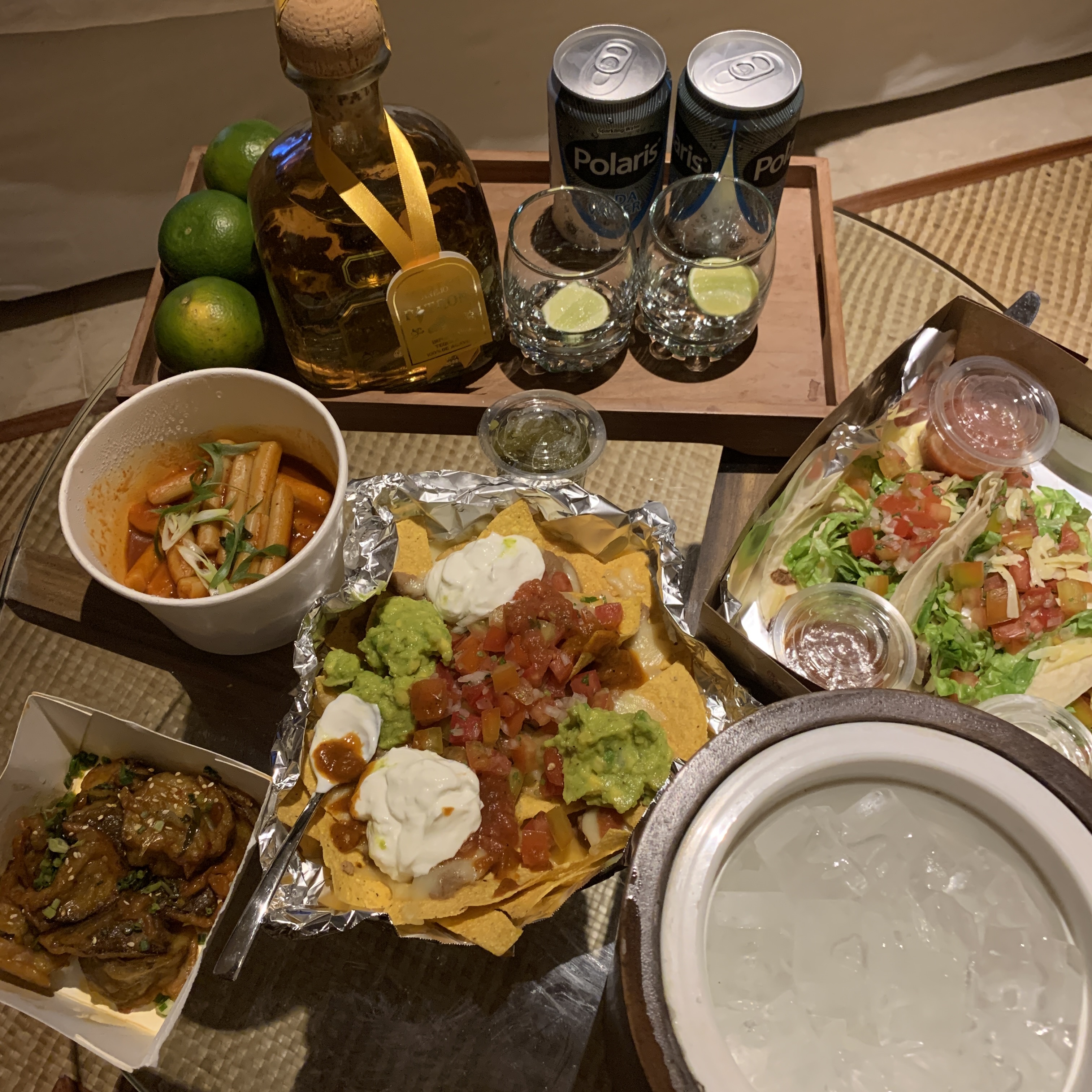 주변 배달음식점들이 괜찮아서 집에서 파티도 즐겼다. 얼음과 잔은 이야기하면 셋팅해주고, 술과 음식들은 각자 준비하자. 한식 떡볶이 가지튀김과 멕시코 타코의 컬래버레이션.
