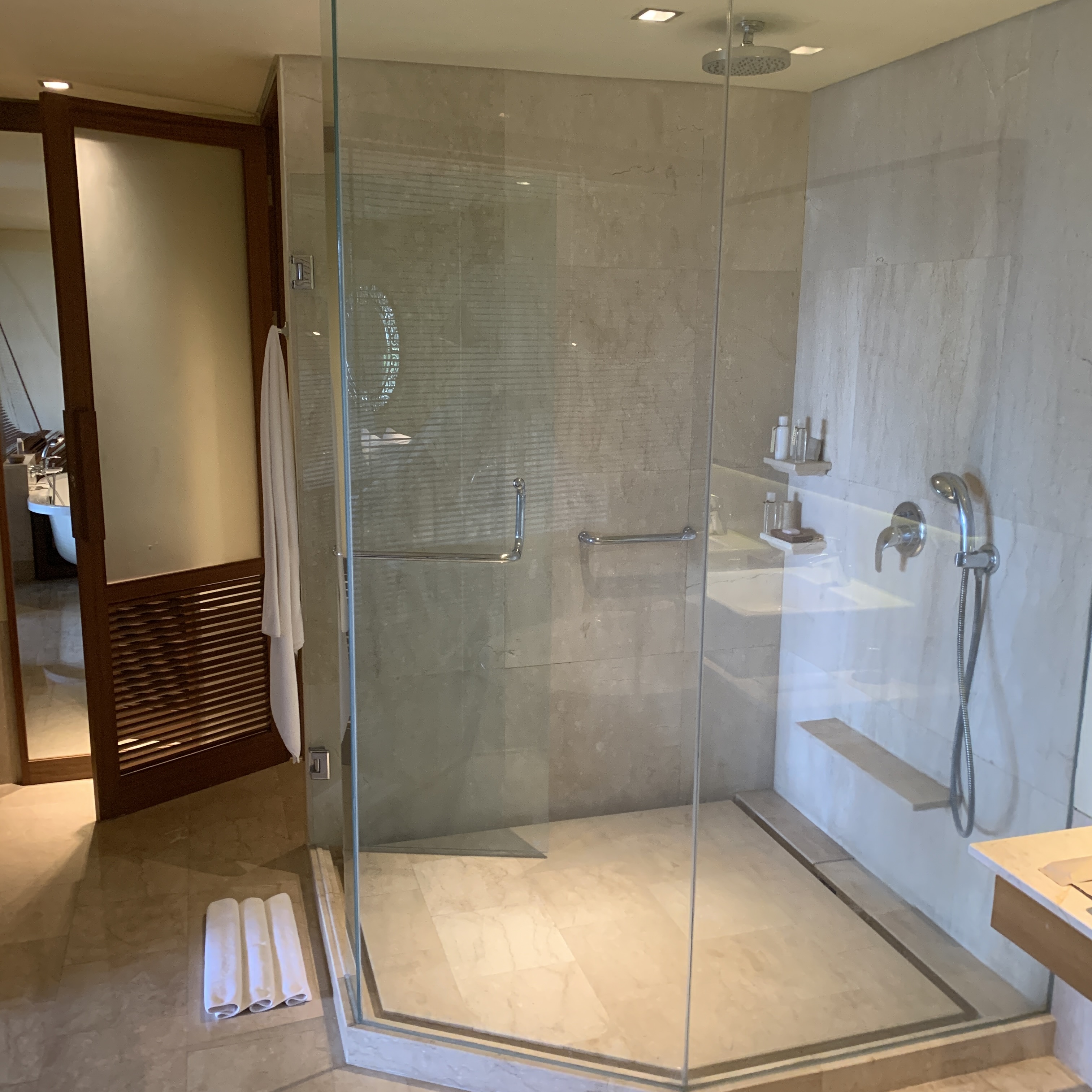 욕실은 세면대가 두개, 대형 욕조가 있다. 샤워실은 유리로 되어있는 구조로 욕실 내 샤워실용 별도 커튼은 없다.