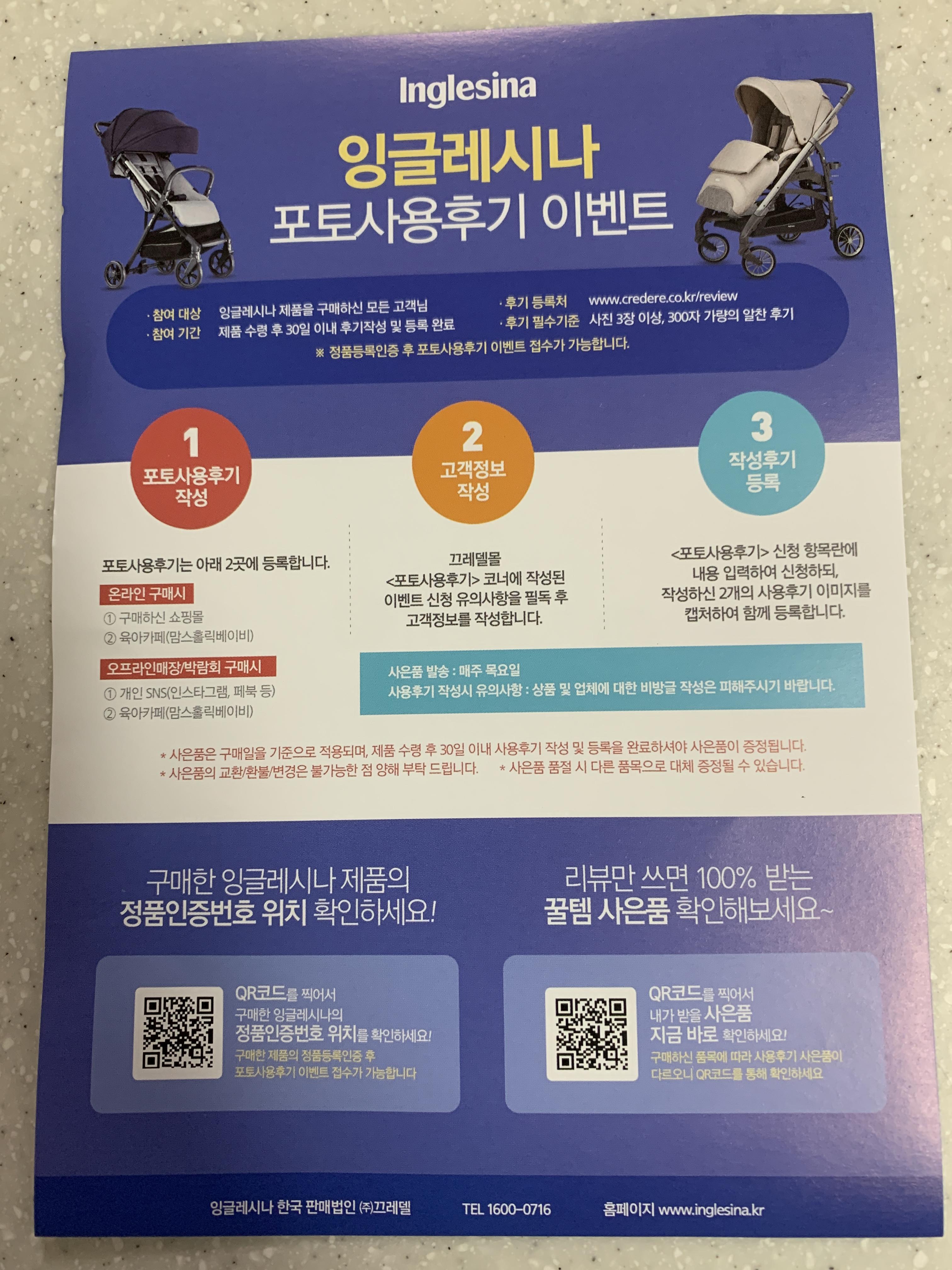 잉글레시나에서는 '포토 사용후기 이벤트'를 진행한다. 유모차 구매 후 사진 후기를 온라인 구매처와 육아카페(맘스홀릭 베이비)에 올리면 7만 원 상당의 방풍커버를 무료로 제공해주니 놓치지 말고 참여하자.