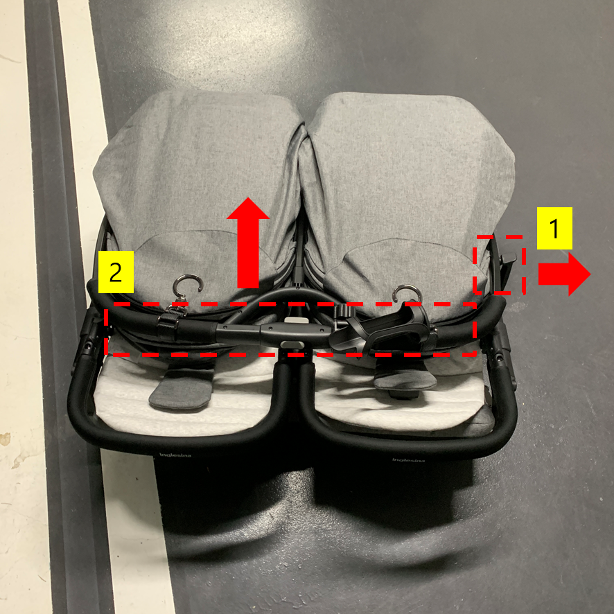 손잡이의 버튼 두 개를 동시에 누른 상태로 아래로 눌러주면 유모차는 접히고, 끝까지 접히고 나면 잠금장치가 자동으로 걸린다. 잠금장치가 걸리면 들어서 이동시에 흔들림 없이 견고하게 고정된다.