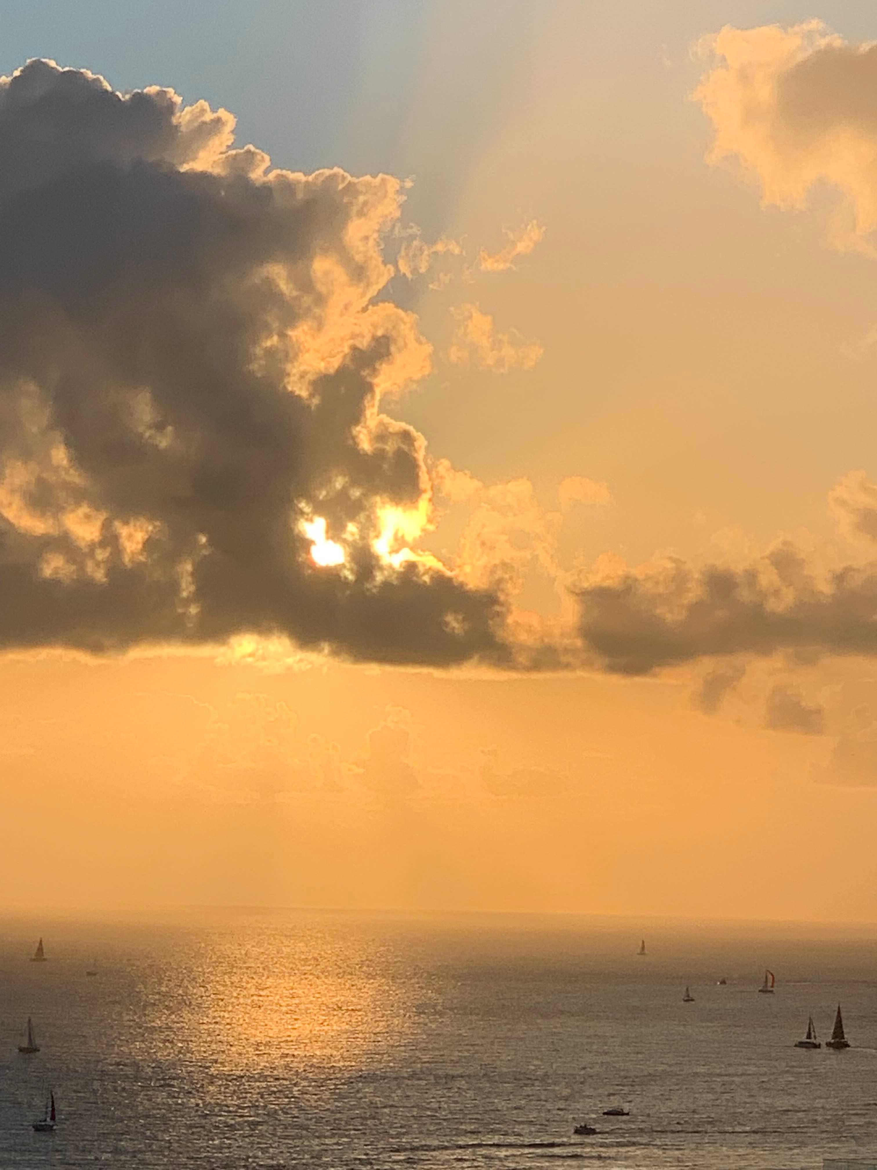 방에서 보이는 와이키키해변과 일몰. 날씨가 좋을 확률이 매우 높기에 매일밤 일몰 구경하는 재미도 쏠쏠하다.