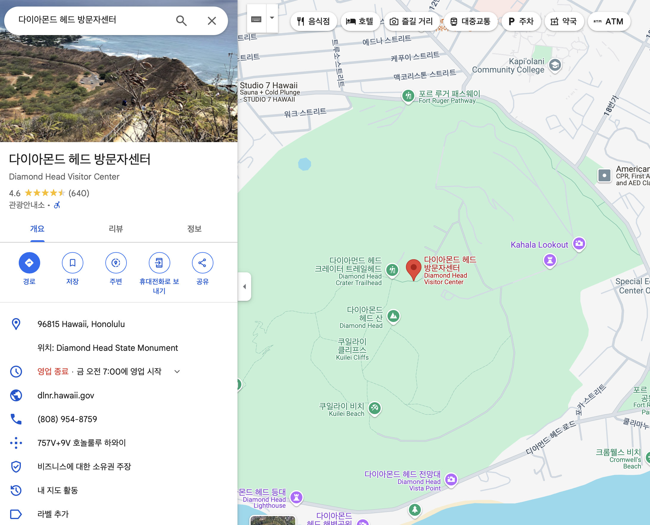 다이아몬드헤드에 주차를 하려면 다이아몬드 헤드 방문자센터를 목적지로 검색하고 와야 입구 바로 앞에 주차를 할 수 있다. 걷는 걸 좋아한다면 터널 들어오기 전 주차장도 있는데 걸음수를 줄이고 싶다면 방문자센터에 주차하자. 거리가 많이 차이 난다.