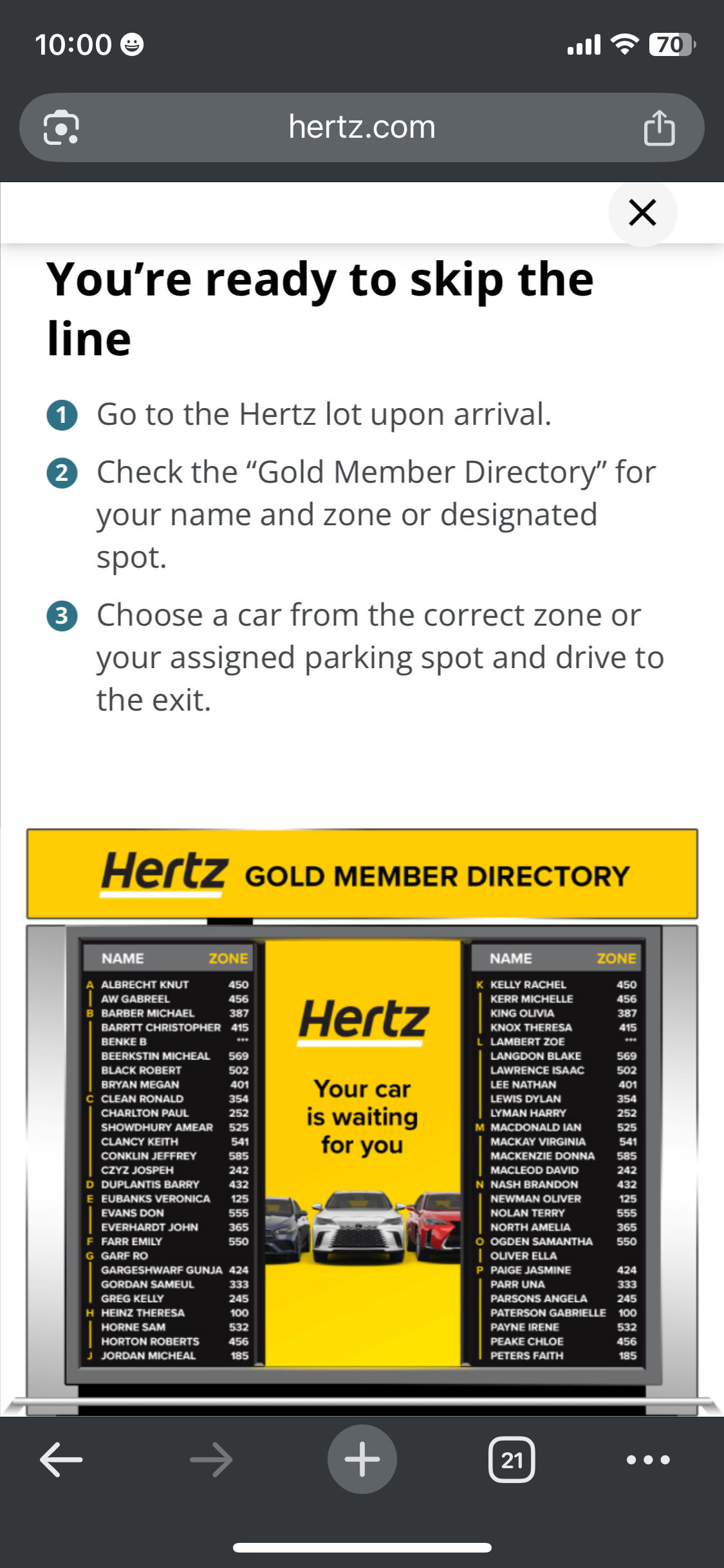 버스 타고 15분 정도 이동하니 허츠에 도착했다. 온라인으로 셀프 체크인을 했었는데 막상 도착하니 내 이름이 없었다. 물어보려고 카운터에 갔는데 줄이 어느 정도 있어서 기다렸다. 나는 골드 멤버라 골드멤버 전용 카운터를 이용했다(골드멤버 가입은 무료이고 가입하면 할인도 되고, 차량 인수시 시간도 절약되니 이용하기를 추천한다).
