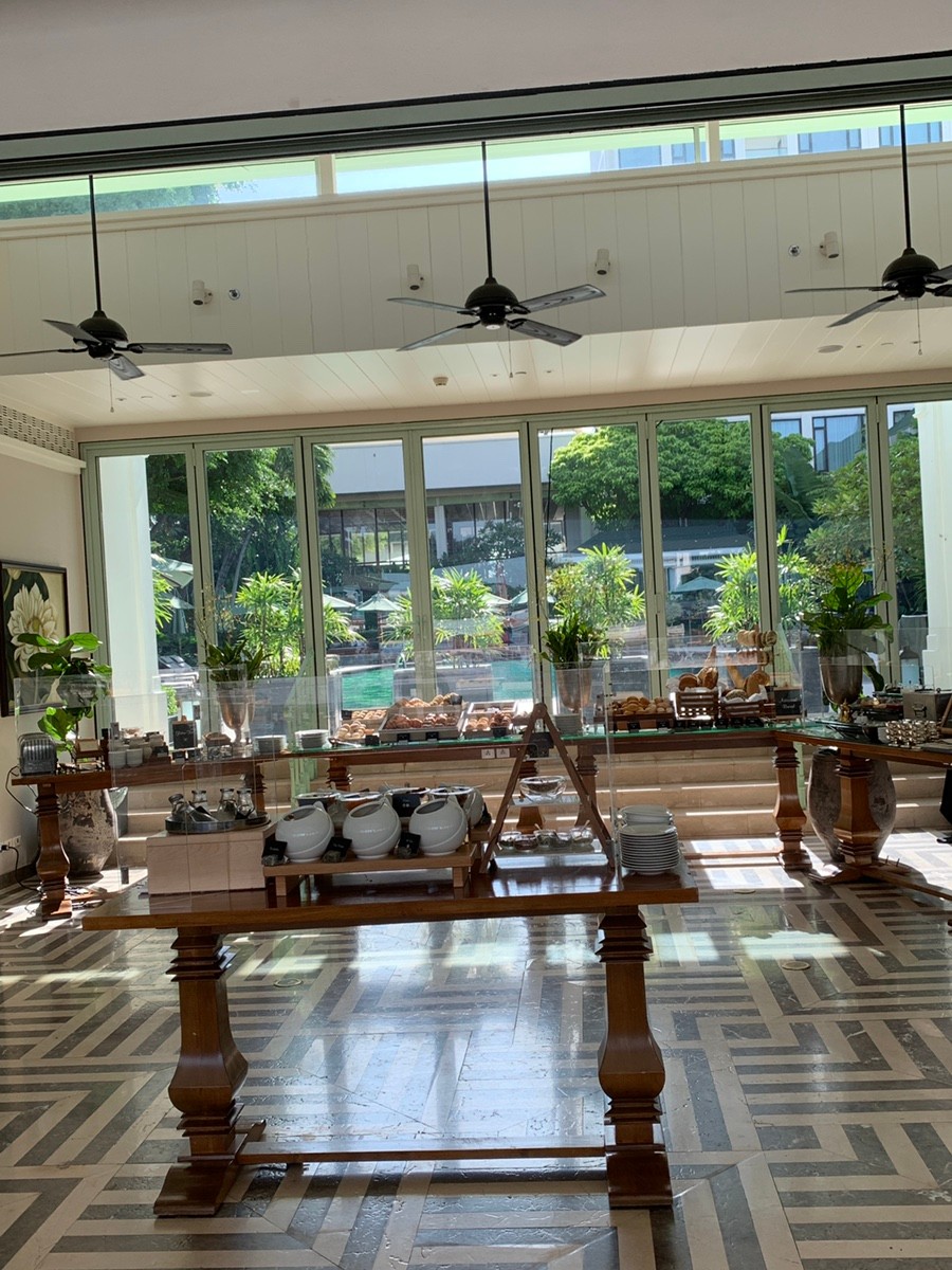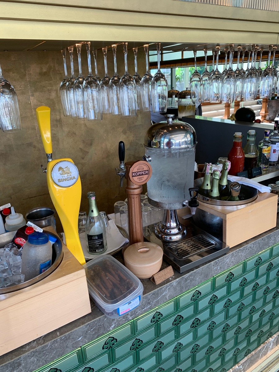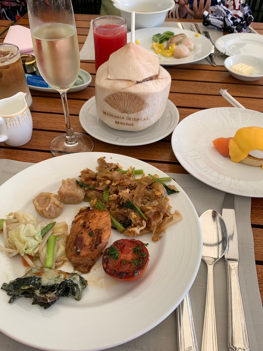 만다린 오리엔탈 방콕의 조식(더 베란다). 이곳의 최대 장점은 뭐니 뭐니 해도 아침부터 무한으로 즐길 수 있는 샴페인. 샴페인 무제한이다. 덕분에 호텔에서 아침술도 먹어본다. 간단한 요리는 자리에서 단품으로 주문 가능하고, 대부분의 요리는 뷔페식으로 원하는 음식을 갖다 먹는 식이다.