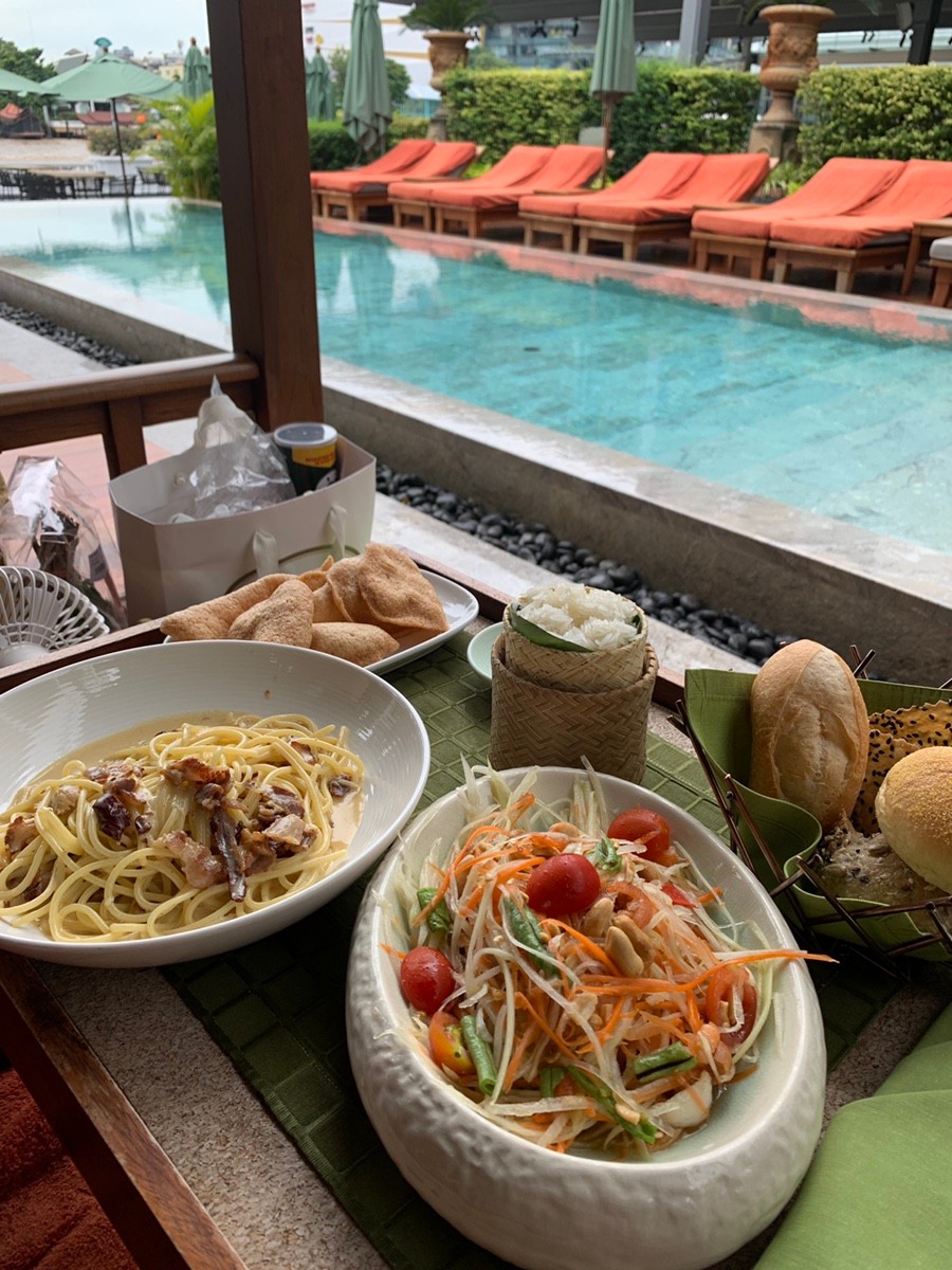 수영장에 도착하면 방갈로와 선배드들이 많이 구비되어있다. 원하는 자리를 선택하면 직원분들이 수건을 깔아주고 자리를 세팅해준다. 우리는 조식 먹고 수영장으로 가서 하루 종일 수영만 했다. 수영장과 붙어있는 식당(더베란다)이 있는데 수영장에서 음식을 주문해서 먹을 수 있다.